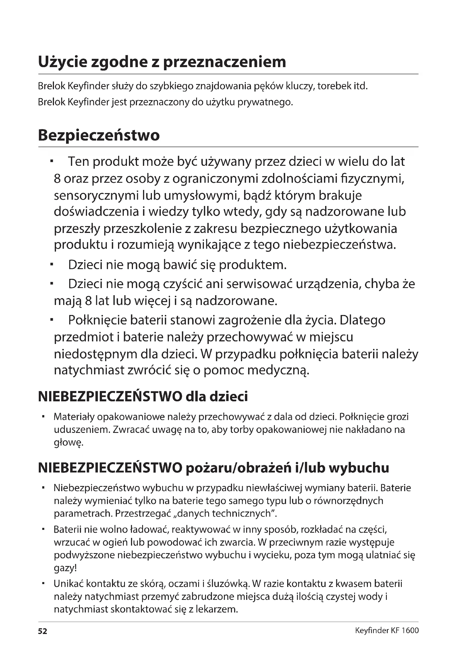 Keyfinder KF 1600 Użycie zgodne z przeznaczeniem Brelok Keyfinder służy do szybkiego znajdowania pęków kluczy, torebek itd. Brelok Keyfinder jest przeznaczony do użytku prywatnego. Bezpieczeństwo Ten produkt może być używany przez dzieci w wielu do lat 8 oraz przez osoby z ograniczonymi zdolnościami zycznymi, sensorycznymi lub umysłowymi, bądź którym brakuje doświadczenia i wiedzy tylko wtedy, gdy są nadzorowane lub przeszły przeszkolenie z zakresu bezpiecznego użytkowania produktu i rozumieją wynikające z tego niebezpieczeństwa. Dzieci nie mogą bawić się produktem. Dzieci nie mogą czyścić ani serwisować urządzenia, chyba że mają 8 lat lub więcej i są nadzorowane. Połknięcie baterii stanowi zagrożenie dla życia. Dlatego przedmiot i baterie należy przechowywać w miejscu niedostępnym dla dzieci. W przypadku połknięcia baterii należy natychmiast zwrócić się o pomoc medyczną. NIEBEZPIECZEŃSTWO dla dzieci Materiały opakowaniowe należy przechowywać z dala od dzieci. Połknięcie grozi uduszeniem. Zwracać uwagę na to, aby torby opakowaniowej nie nakładano na głowę. NIEBEZPIECZEŃSTWO pożaru/obrażeń i/lub wybuchu Niebezpieczeństwo wybuchu w przypadku niewłaściwej wymiany baterii. Baterie należy wymieniać tylko na baterie tego samego typu lub o równorzędnych parametrach. Przestrzegać „danych technicznych”. Baterii nie wolno ładować, reaktywować w inny sposób, rozkładać na części, wrzucać w ogień lub powodować ich zwarcia. W przeciwnym razie występuje podwyższone niebezpieczeństwo wybuchu i wycieku, poza tym mogą ulatniać się gazy! Unikać kontaktu ze skórą, oczami i śluzówką. W razie kontaktu z kwasem baterii należy natychmiast przemyć zabrudzone miejsca dużą ilością czystej wody i natychmiast skontaktować się z lekarzem. Druckbuch Key Finder.indb 52 20.04.2016 14:38:49Bezpieczeństwo