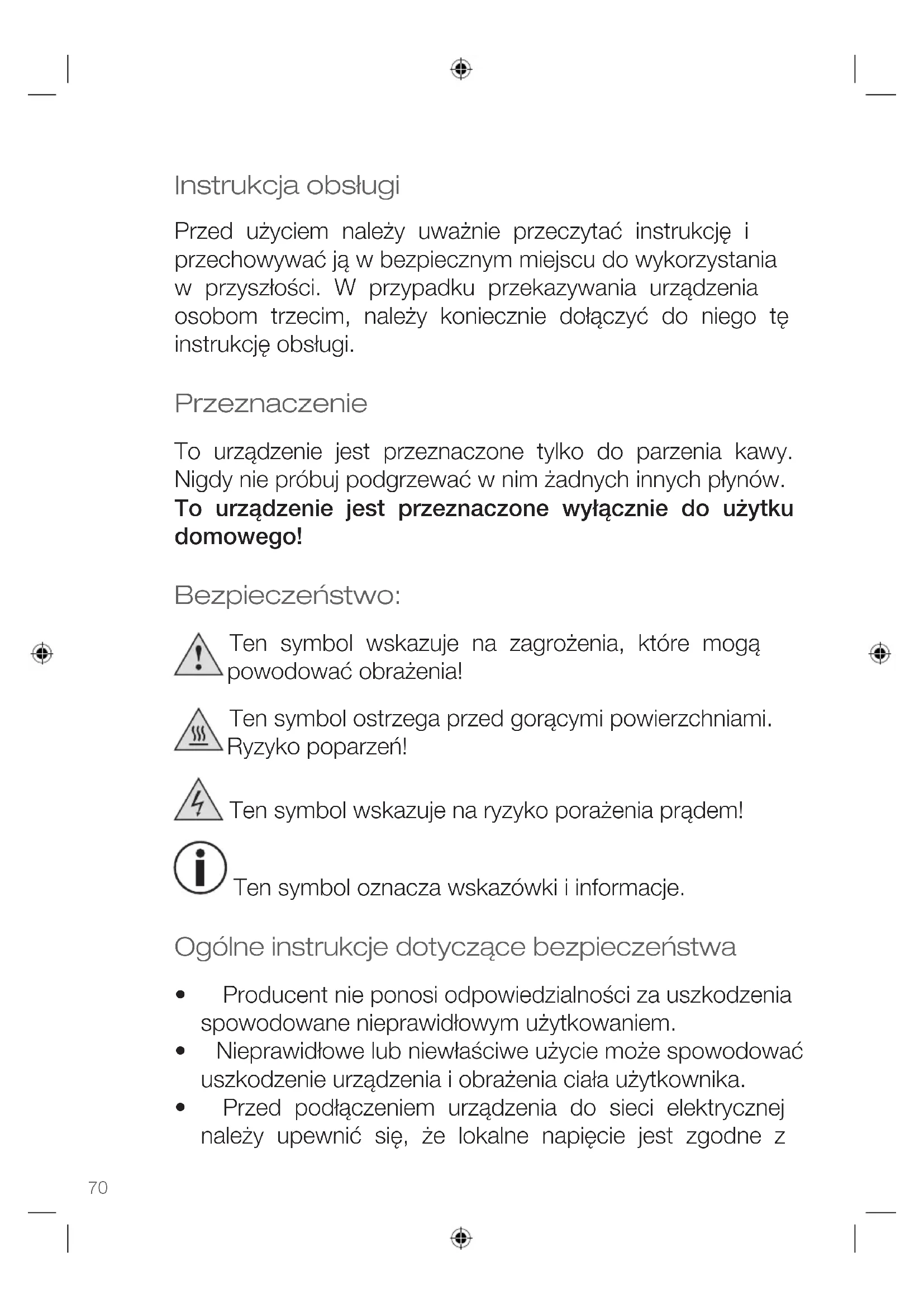- ürün sahibinin neden olduğu hasarlar için Bu garanti, ulusal mevzuat uyarınca müşteri olarak sahip olabileceğiniz herhangi bir yasal hakkı veya kanunlarla size verilen müşteri haklarınızı etkilemez. Garanti süresi boyunca, bir garanti durumunda hak iddia edebilmek için müşterinin satın alma tarihini belgeleyen bir kanıt (makbuz) sunmalıdır. Garanti kapsamında hak iddiaları aşağıdaki şirkete yöneltilecektir KORONA electric GmbH, Sundern/Almanya. Müşteri Hattı: +49 2933 90284-80 E-posta service@korona-electric.de web: www.korona-electric.de satın alma tarihinden itibaren 2 yıl içinde. Garanti durumunda müşteriye cihazı masraar kendisinden olmak üzere veya yetkili bir mağazada tamir ettirme hakkı verilir. Müşteriye başka ekstra haklar (garanti durumu nedeniyle) verilmez.70 Instrukcja obsługi Przed użyciem należy uważnie przeczytać instrukcję i przechowywać ją w bezpiecznym miejscu do wykorzystania w przyszłości. W przypadku przekazywania urządzenia osobom trzecim, należy koniecznie dołączyć do niego tę instrukcję obsługi. Przeznaczenie To urządzenie jest przeznaczone tylko do parzenia kawy. Nigdy nie próbuj podgrzewać w nim żadnych innych płynów. To urządzenie jest przeznaczone wyłącznie do użytku domowego! Bezpieczeństwo: Ten symbol wskazuje na zagrożenia, które mogą powodować obrażenia! Ten symbol ostrzega przed gorącymi powierzchniami. Ryzyko poparzeń! Ten symbol wskazuje na ryzyko porażenia prądem! Ten symbol oznacza wskazówki i informacje. Ogólne instrukcje dotyczące bezpieczeństwa