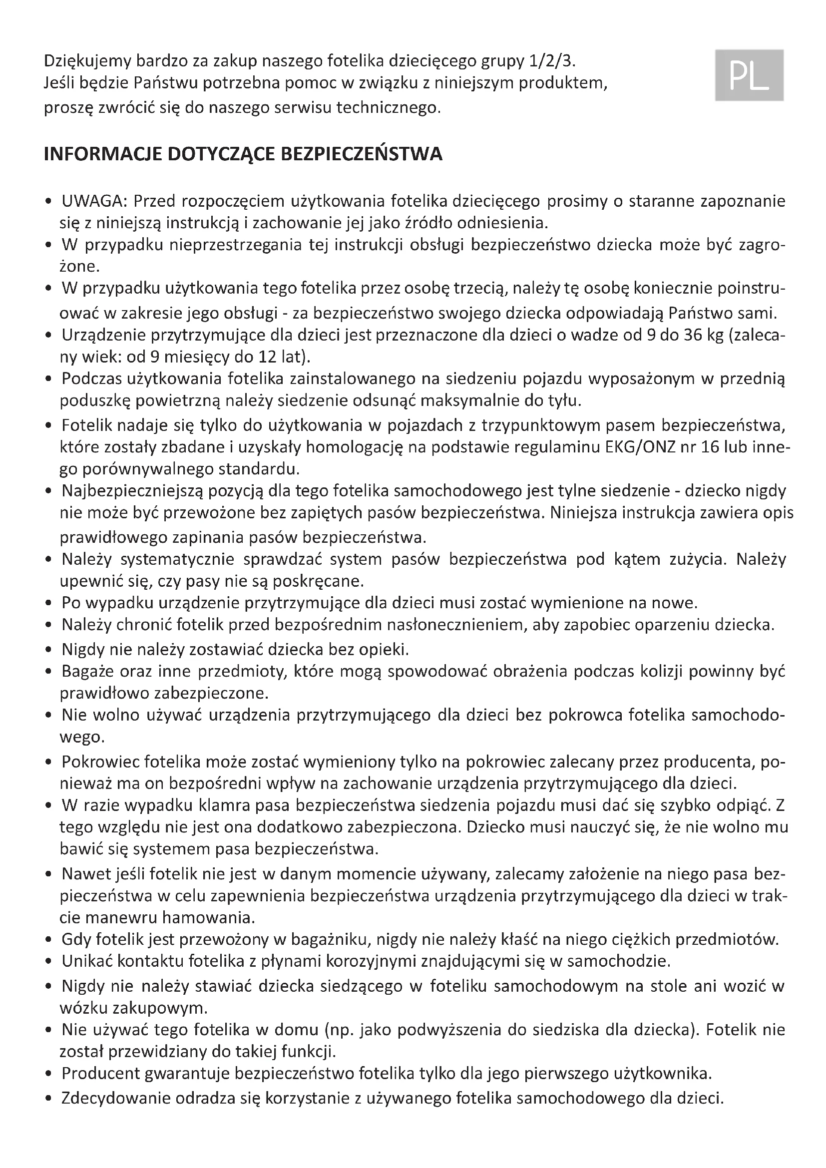 - UWAGA: Przed rozpoczęciem użytkowania fotelika dziecięcego prosimy o staranne zapoznanie się z niniejszą instrukcją i zachowanie jej jako źródło odniesienia.