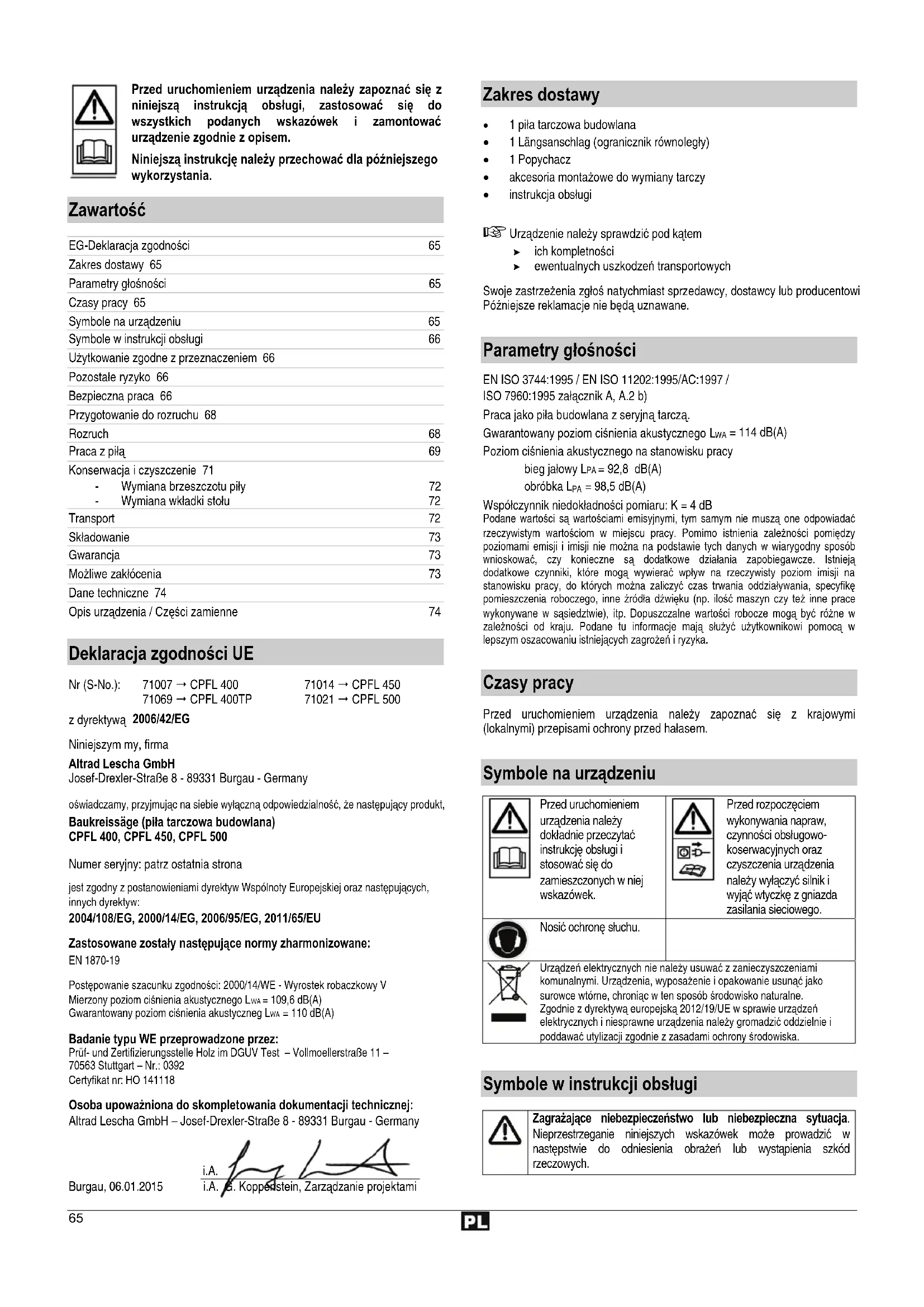 z dyrektywą 2006/42/EG Niniejszym my, firma Altrad Lescha GmbH Josef-Drexler-Straße 8 - 89331 Burgau - Germany oświadczamy, przyjmując na siebie wyłączną odpowiedzialność, że następujący produkt, Baukreissäge (piła tarczowa budowlana) CPFL 400, CPFL 450, CPFL 500 Numer seryjny: patrz ostatnia strona jest zgodny z postanowieniami dyrektyw Wspólnoty Europejskiej oraz następujących, innych dyrektyw: 2004/108/EG, 2000/14/EG, 2006/95/EG, 2011/65/EU Zastosowane zostały następujące normy zharmonizowane: EN 1870-19 Postępowanie szacunku zgodności: 2000/14/WE - Wyrostek robaczkowy V Mierzony poziom ciśnienia akustycznego L = 109,6 dB(A) Gwarantowany poziom ciśnienia akustyczneg L = 110 dB(A) Badanie typu WE przeprowadzone przez: Prüf- und Zertifizierungsstelle Holz im DGUV Test – Vollmoellerstraße 11 – 70563 Stuttgart – Nr.: 0392 Certyfikat nr: HO 141118 Osoba upoważniona do skompletowania dokumentacji technicznej: Altrad Lescha GmbH – Josef-Drexler-Straße 8 - 89331 Burgau - Germany