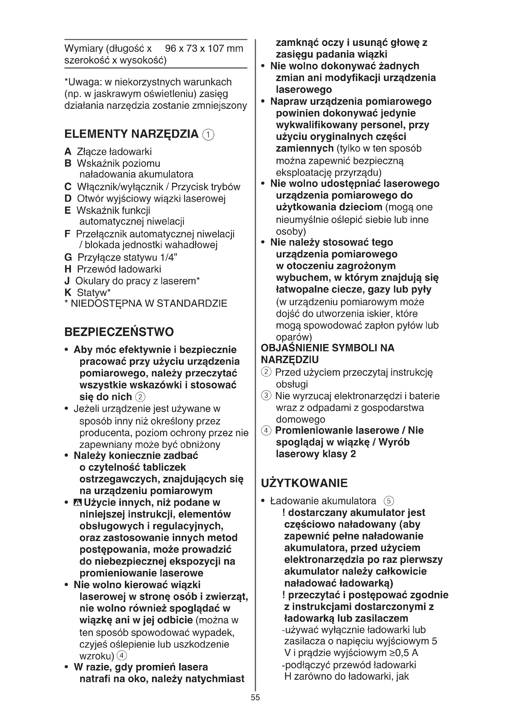 - W razie, gdy promień lasera natra na oko, należy natychmiast56 niwelacji, lub przesunąć przełącznik F w położenie