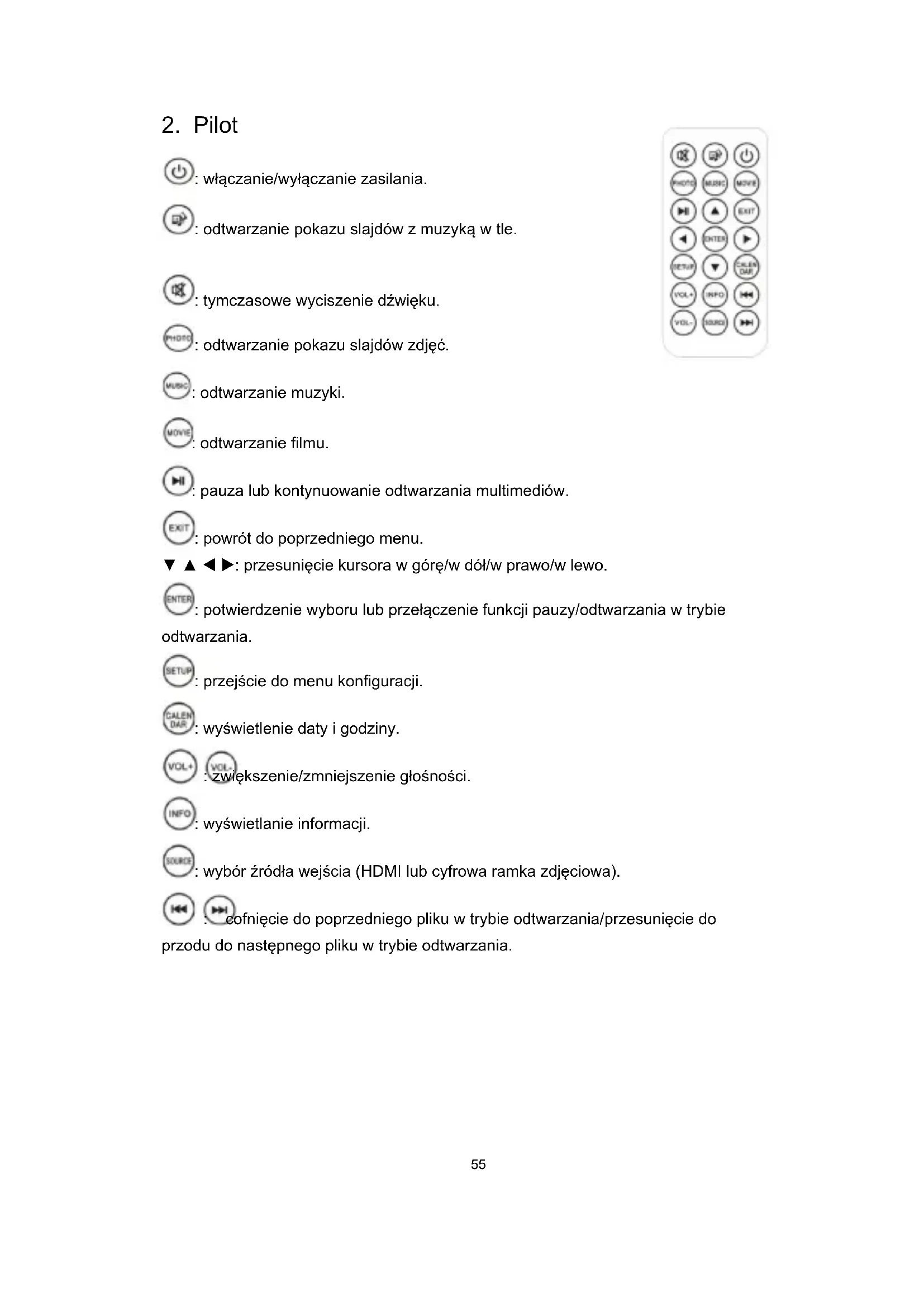 : włączanie/wyłączanie zasilania. : odtwarzanie pokazu slajdów z muzyką w tle. : tymczasowe wyciszenie dźwięku. : odtwarzanie pokazu slajdów zdjęć. : odtwarzanie muzyki. : odtwarzanie filmu. : pauza lub kontynuowanie odtwarzania multimediów. : powrót do poprzedniego menu. ▼ ▲ : przesunięcie kursora w górę/w dół/w prawo/w lewo. : potwierdzenie wyboru lub przełączenie funkcji pauzy/odtwarzania w trybie odtwarzania. : przejście do menu konfiguracji. : wyświetlenie daty i godziny. : zwiększenie/zmniejszenie głośności. : wyświetlanie informacji. : wybór źródła wejścia (HDMI lub cyfrowa ramka zdjęciowa). : cofnięcie do poprzedniego pliku w trybie odtwarzania/przesunięcie do przodu do następnego pliku w trybie odtwarzania.56