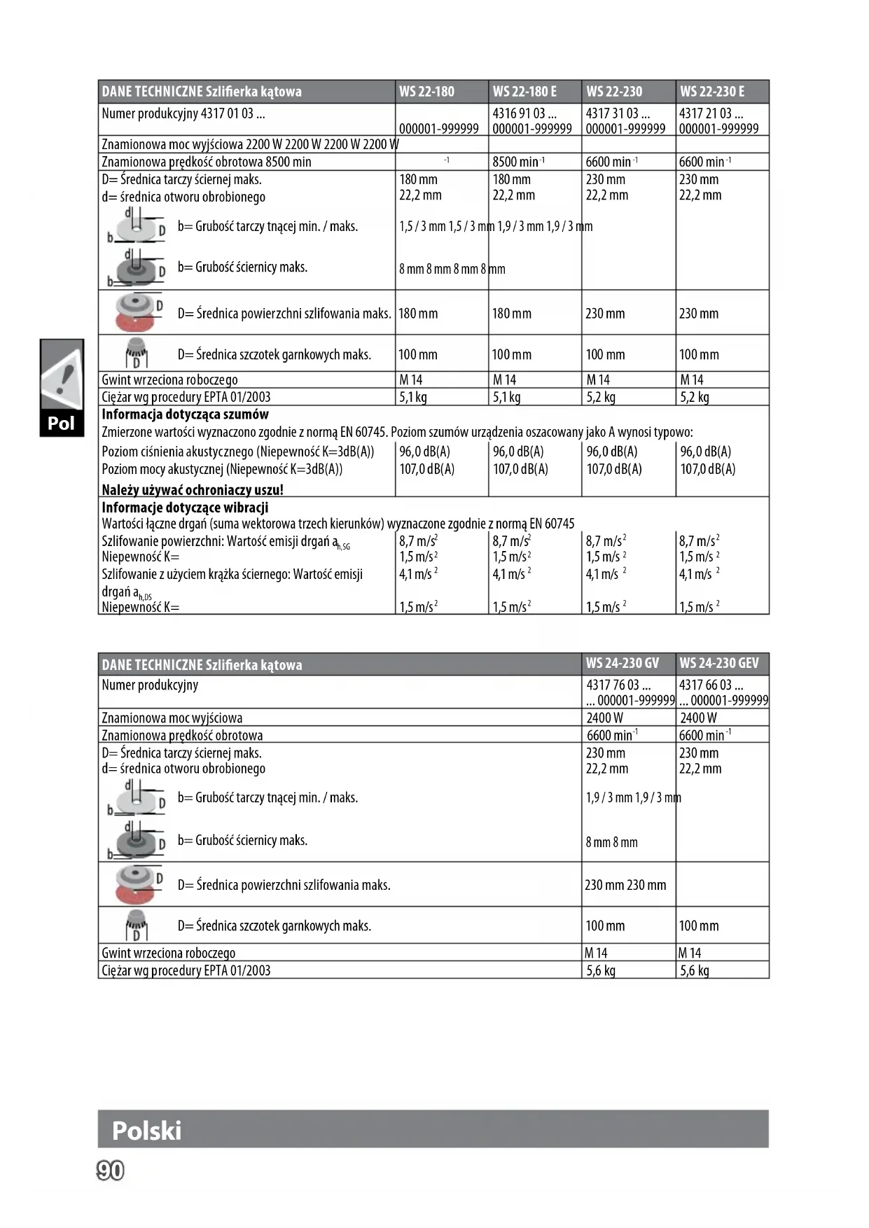 D= Średnica tarczy ściernej maks. d= średnica otworu obrobionego 180 mm 22,2 mm 180 mm 22,2 mm 230 mm 22,2 mm 230 mm 22,2 mm b= Grubość tarczy tnącej min. / maks. 1,5 / 3 mm 1,5 / 3 mm 1,9 / 3 mm 1,9 / 3 mm b= Grubość ściernicy maks. 8 mm 8 mm 8 mm 8 mm D= Średnica powierzchni szlifowania maks. 180 mm 180 mm 230 mm 230 mm D= Średnica szczotek garnkowych maks. 100 mm 100 mm 100 mm 100 mm Gwint wrzeciona roboczego M 14 M 14 M 14 M 14 Ciężar wg procedury EPTA 01/2003 5,1 kg 5,1 kg 5,2 kg 5,2 kg Informacja dotycząca szumów Zmierzone wartości wyznaczono zgodnie z normą EN 60745. Poziom szumów urządzenia oszacowany jako A wynosi typowo: Poziom ciśnienia akustycznego (Niepewność K=3dB(A)) 96,0 dB(A) 96,0 dB(A) 96,0 dB(A) 96,0 dB(A) Poziom mocy akustycznej (Niepewność K=3dB(A)) Należy używać ochroniaczy uszu! 107,0 dB(A) 107,0 dB(A) 107,0 dB(A) 107,0 dB(A) Informacje dotyczące wibracji Wartości łączne drgań (suma wektorowa trzech kierunków) wyznaczone zgodnie z normą EN 60745 Szlifowanie powierzchni: Wartość emisji drgań a h,SG Niepewność K= 8,7 m/s
