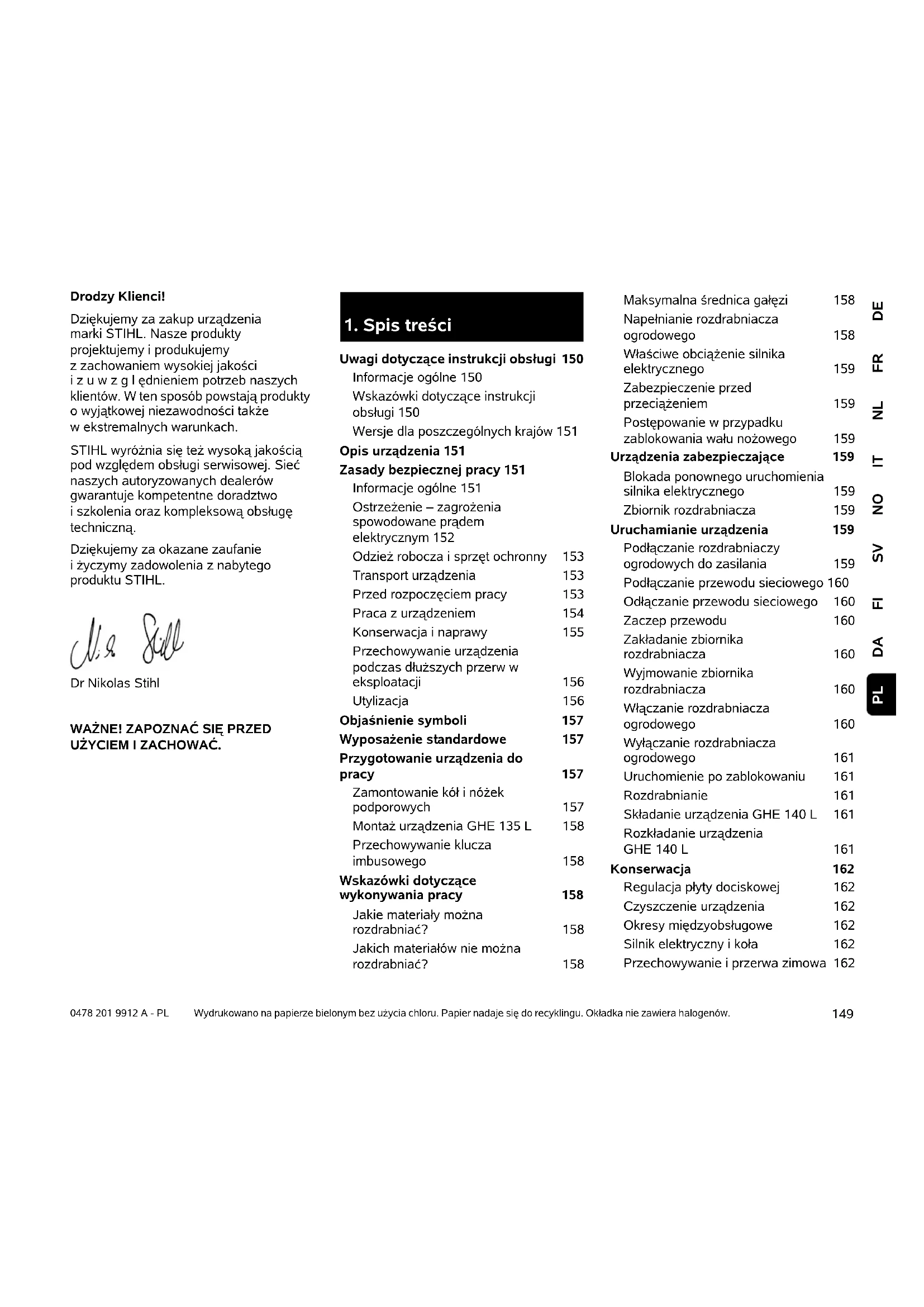 Uwagi dotyczące instrukcji obsługi 150 Informacje ogólne 150 Wskazówki dotyczące instrukcji obsługi 150 Wersje dla poszczególnych krajów 151 Opis urządzenia 151 Zasady bezpiecznej pracy 151 Informacje ogólne 151 Ostrzeżenie – zagrożenia spowodowane prądem elektrycznym 152 Odzież robocza i sprzęt ochronny 153 Transport urządzenia 153 Przed rozpoczęciem pracy 153 Praca z urządzeniem 154 Konserwacja i naprawy 155 Przechowywanie urządzenia podczas dłuższych przerw w eksploatacji 156 Utylizacja 156 Objaśnienie symboli 157 Wyposażenie standardowe 157 Przygotowanie urządzenia do pracy 157 Zamontowanie kół i nóżek podporowych 157 Montaż urządzenia GHE 135 L 158 Przechowywanie klucza imbusowego 158 Wskazówki dotyczące wykonywania pracy 158 Jakie materiały można rozdrabniać?158 Jakich materiałów nie można rozdrabniać?158 Maksymalna średnica gałęzi 158 Napełnianie rozdrabniacza ogrodowego 158 Właściwe obciążenie silnika elektrycznego 159 Zabezpieczenie przed przeciążeniem 159 Postępowanie w przypadku zablokowania wału nożowego 159 Urządzenia zabezpieczające 159 Blokada ponownego uruchomienia silnika elektrycznego 159 Zbiornik rozdrabniacza 159 Uruchamianie urządzenia 159 Podłączanie rozdrabniaczy ogrodowych do zasilania 159 Podłączanie przewodu sieciowego 160 Odłączanie przewodu sieciowego 160 Zaczep przewodu 160 Zakładanie zbiornika rozdrabniacza 160 Wyjmowanie zbiornika rozdrabniacza 160 Włączanie rozdrabniacza ogrodowego 160 Wyłączanie rozdrabniacza ogrodowego 161 Uruchomienie po zablokowaniu 161 Rozdrabnianie 161 Składanie urządzenia GHE 140 L 161 Rozkładanie urządzenia GHE 140 L 161 Konserwacja 162 Regulacja płyty dociskowej 162 Czyszczenie urządzenia 162 Okresy międzyobsługowe 162 Silnik elektryczny i koła162 Przechowywanie i przerwa zimowa 1620478 201 9912 A - PL