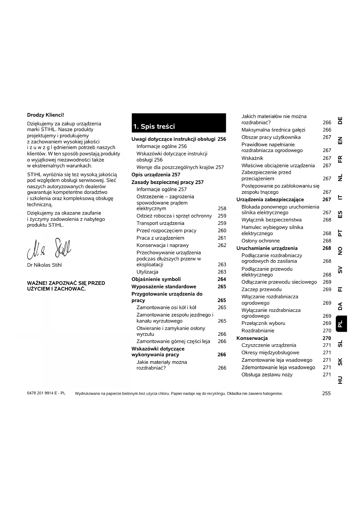 DEENFRNLITESPTNOSVFIDASLSKHU PL 0478 201 9914 E - PL Drodzy Klienci! Dziękujemy za zakup urządzenia marki STIHL. Nasze produkty projektujemy i produkujemy z zachowaniem wysokiej jakości izuwzględnieniem potrzeb naszych klientów. W ten sposób powstają produkty owyjątkowej niezawodności także w ekstremalnych warunkach. STIHL wyróżnia się też wysoką jakością pod względem obsługi serwisowej. Sieć naszych autoryzowanych dealerów gwarantuje kompetentne doradztwo i szkolenia oraz kompleksową obsługę techniczną. Dziękujemy za okazane zaufanie i życzymy zadowolenia z nabytego produktu STIHL. Dr Nikolas Stihl