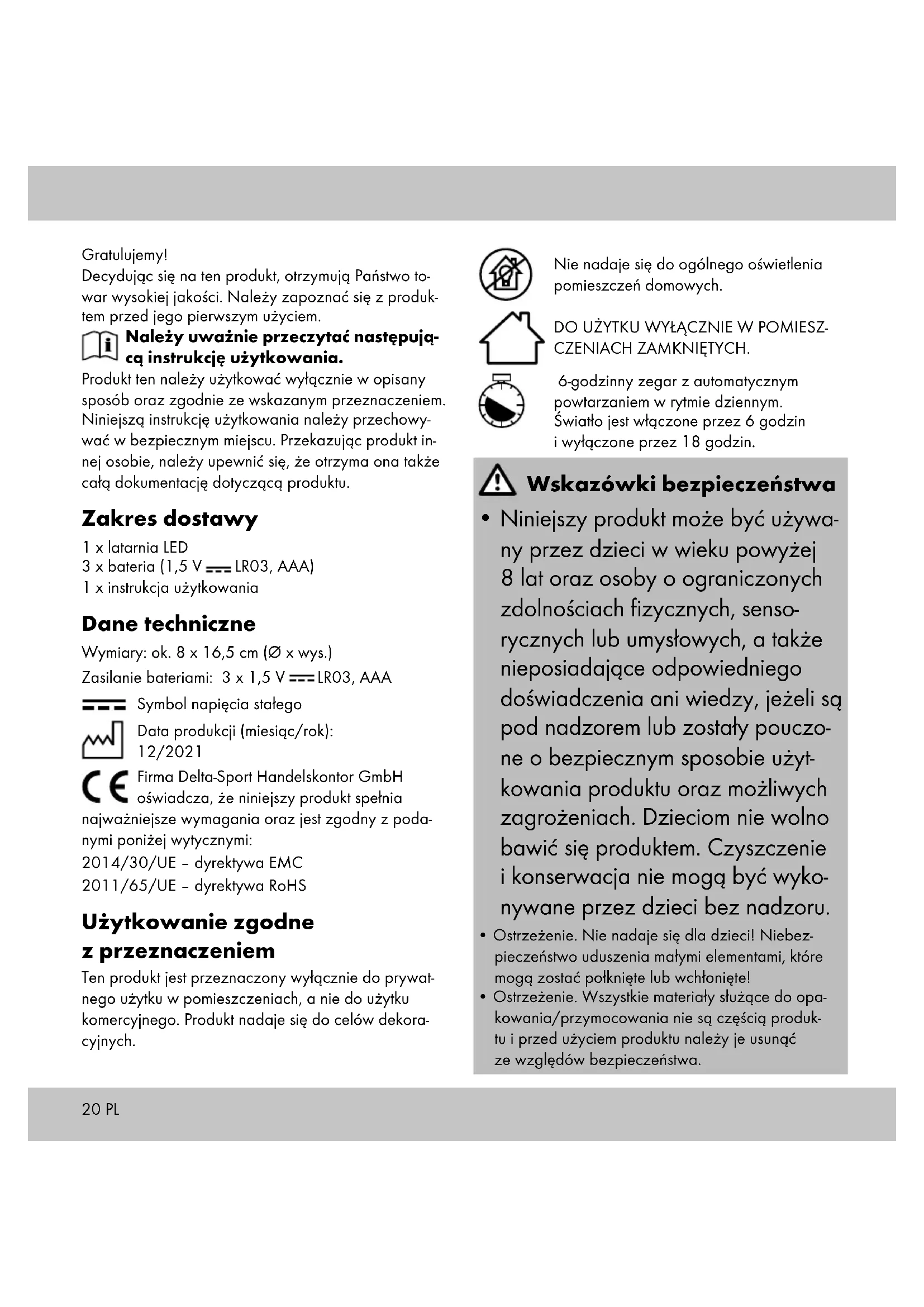 Wymiana baterii Jeśli baterie już nie działają, można je wymienić na nowe. Podczas wymiany rozładowanych baterii postępować zgodnie z opisem w punkcie „Wkładanie baterii”. Przed włożeniem nowych baterii należy wyjąć stare z komory baterii. PL22 Włączanie i wyłączanie światła (rys. A) Przesunąć przełącznik (1c) na pozycję „ON”, aby włączyć produkt (1). Przesunąć przełącznik (1c) na pozycję „OFF”, aby wyłączyć produkt. Przesunąć przełącznik (1c) na pozycję „TIMER”, aby aktywować w produkcie funkcję timera. Wskazówka: w przypadku aktywnej funkcji timera światło jest włączane na 6 godzin, a następnie wyłą- czane na 18 godzin. Użytkowanie Produkt może być ustawiony lub powieszony w za- mkniętych pomieszczeniach. Wskazówka: nie wolno stawiać produktu na de- likatnych powierzchniach. Może to doprowadzić do zadrapań. W przypadku wieszania produktu należy wziąć pod uwagę jego masę własną. Przechowywanie, czyszczenie Podczas nieużywania należy zawsze przechowywać produkt w suchym i czystym miejscu, z wyjętymi bate- riami, w temperaturze pokojowej. Czyścić wyłącznie przy użyciu wilgotnej ściereczki, następnie wytrzeć do sucha. WAŻNE! Nie czyścić przy użyciu ostrych środków czyszczących. Uwagi odnośnie recyklingu Jeśli produkt jest zużyty, nie należy go wyrzucać wraz z odpadami domowymi ze względu na ochronę środowiska, ale nale- ży go odpowiednio zutylizować. Informacje o punk- tach zbiórki i godzinach otwarcia można uzyskać w lokalnej administracji. Uszkodzone lub zużyte baterie/akumulatory należy poddać recyklingowi zgodnie z dyrektywą 2006/66/WE i jej zmianami. Zwrócić baterie/aku- mulatory i/lub produkt, korzystając z udostępnionych urządzeń przeznaczonych do zbiórki. Opakowania, takie jak torby plastikowe, nie powinny znaleźć się w rękach dzieci. Opakowanie przechowywać w miejscu niedostępnym dla dzieci. Nieprawidłowa utylizacja baterii/akumulato- rów wyrządza szkody w środowisku natural- nym! Baterii/akumulatorów nie wolno wyrzucać razem z odpadami domowymi. Mogą zawierać toksyczne metale ciężkie i podlegają obróbce odpadów niebezpiecznych. Symbole chemicz- ne metali ciężkich są następujące: Cd = kadm, Hg = rtęć, Pb = ołów. Zużyte baterie/akumulatory należy oddawać w miejskim punkcie zbiórki. Produkt oraz opakowanie należy utylizować w sposób przyjazny dla środowiska. Przestrzegać oznakowania materiałów opakowaniowych podczas segregacji odpadów. Są one oznaczone skrótami (a) i liczbami (b) o następującym znaczeniu: 1–7: tworzywa sztuczne/20–22: papier i karton/80–98: materiały kompozytowe. Produkt i materiały opakowaniowe nadają się do recy- klingu, należy je osobno zutylizować w celu lepszego przetwarzania odpadów. Logo Triman obowiązuje tylko we Francji. Informacje o sposobie utylizacji zużytego produktu są dostępne u władz lokalnych lub miejskich. PL23 Wskazówki dotyczące gwarancji i obsługi serwisowej Artykuł został wyprodukowany z najwyższą staran- nością i pod stałą kontrolą. DELTA-SPORT HANDEL- SKONTOR GmbH przyznaje klientowi końcowemu na niniejszy artykuł trzy lata gwarancji od daty zakupu (okres gwarancyjny) z zastrzeżeniem poniższych postanowień. Gwarancja dotyczy wyłącznie wad materiałowych i wad wykonania. Gwarancja nie obejmuje części, które podlegają normalnemu zużyciu i z tego względu należy je traktować jako części zuży- walne (np. baterie) i nie obejmuje części kruchych, np. przełączników, akumulatorów ani części wykonanych ze szkła. Wyklucza się roszczenia z tytułu niniejszej gwarancji w przypadku użycia artykułu w sposób niewłaściwy lub sprzeczny z jego przeznaczeniem lub w sposób wykraczający poza przewidziane przeznaczenie lub poza przewidziany zakres użytkowania lub jeśli wy- tyczne zawarte w instrukcji obsługi nie były przestrze- gane, chyba że klient końcowy udowodni istnienie wady materiałowej lub wady wykonania, która nie wynika z podanych wyżej przyczyn. Roszczenia z tytułu gwarancji można zgłaszać wyłącznie w okresie gwarancyjnym za okazaniem oryginalnego dowodu zakupu. Prosimy zatem zacho- wać oryginalny dowód zakupu! W przypadku jakichkolwiek reklamacji prosimy skontaktować się z nami najpierw za pośrednic- twem podanej poniżej infolinii serwisowej lub drogą e-mailową. W przypadku objętym gwarancją artykuł zostanie – według naszego uznania – bezpłatnie na- prawiony, wymieniony lub nastąpi zwrot ceny zakupu. Z gwarancji nie wynikają żadne inne prawa. Niniejsza gwarancja nie ogranicza Państwa ustawo- wych praw, w szczególności roszczeń gwarancyjnych wobec danego sprzedawcy. W przypadku wymiany części lub całego artykułu okres gwarancji przedłuża się o trzy lata zgodnie z art. 581 § 1 kodeksu cywilnego. Po upłynięciu czasu gwarancji powstałe naprawy są płatne. IAN: 398633_2107 Serwis Polska Tel.: 22 397 4996 E-Mail: deltasport@lidl.pl PL24 CZ Srdečně blahopřejeme! Svým nákupem jste se rozhodli pro kvalitní výrobek. Před prvním použitím se prosím seznamte s tímto výrobkem. Pozorně si přečtete následující návod k použití. Používejte tento výrobek pouze tak, jak je popsáno, a pro uvedené účely. Uschovejte si tento návod k použití pro budoucí použití. Pokud výrobek předáte třetí osobě, předejte jí i veškerou dokumentaci. Obsah balení 1 x LED lucerna 3 x baterie (1,5 V LR03, AAA) 1 x návod k použití Technické údaje Rozměry: cca 8 x 16,5 cm (Ø x výška) Zdroj energie (baterie): 3 x 1,5 V LR03, AAA Symbol pro stejnosměrné napětí Datum výroby (měsíc/rok): 12/2021 Společnost Delta-Sport Handelskontor GmbH tímto prohlašuje, že tento výrobek je v souladu s následujícími základními požadavky a ostatními příslušnými ustanoveními: 2014/30/EU – Směrnice o EMK 2011/65/EU – Směrnice RoHS Použití dle určení Výr