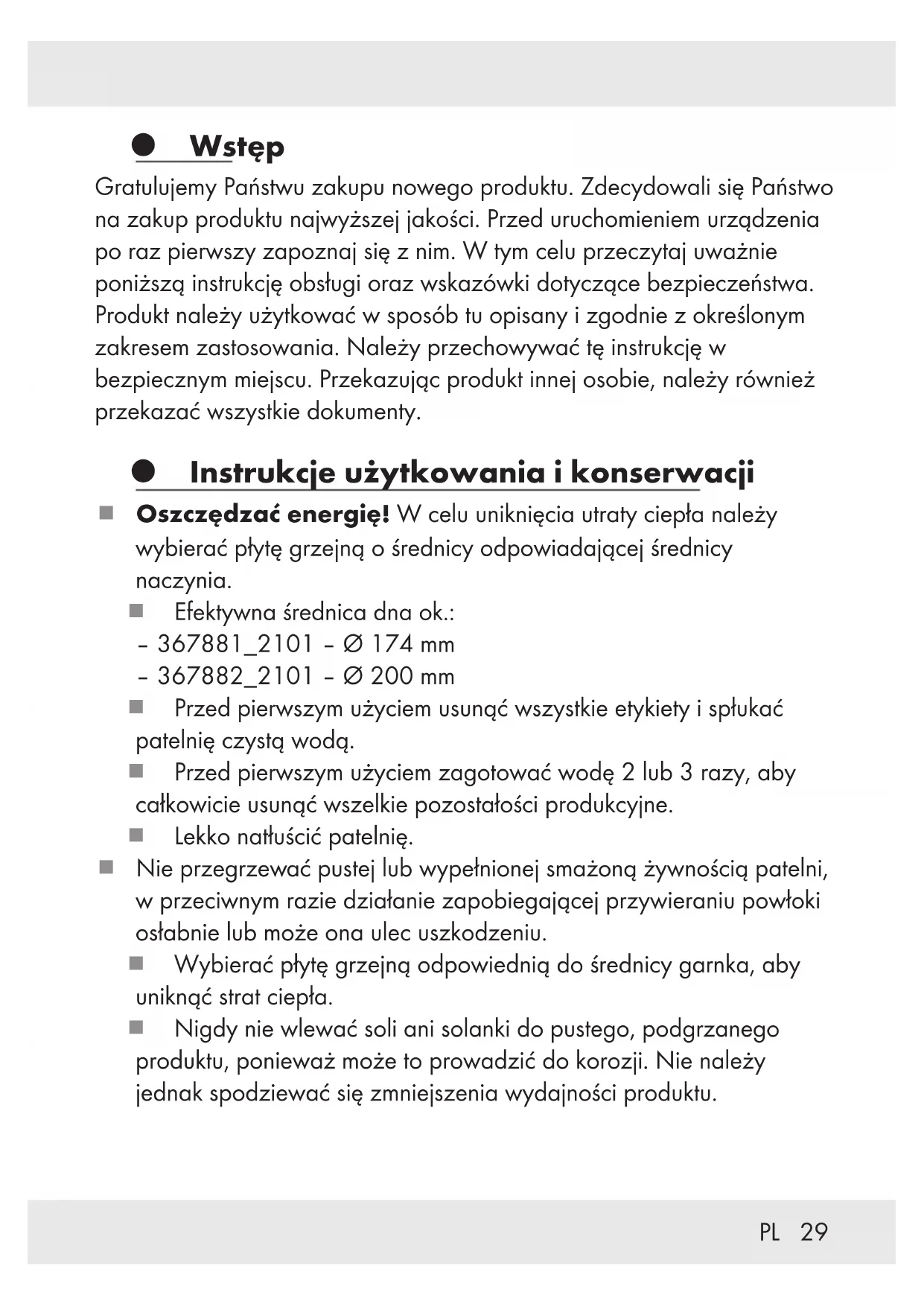 Wstęp Gratulujemy Państwu zakupu nowego produktu. Zdecydowali się Państwo na zakup produktu najwyższej jakości. Przed uruchomieniem urządzenia po raz pierwszy zapoznaj się z nim. W tym celu przeczytaj uważnie poniższą instrukcję obsługi oraz wskazówki dotyczące bezpieczeństwa. Produkt należy użytkować w sposób tu opisany i zgodnie z określonym zakresem zastosowania. Należy przechowywać tę instrukcję w bezpiecznym miejscu. Przekazując produkt innej osobie, należy również przekazać wszystkie dokumenty. Instrukcje użytkowania i konserwacji Oszczędzać energię! W celu uniknięcia utraty ciepła należy wybierać płytę grzejną o średnicy odpowiadającej średnicy naczynia. Efektywna średnica dna ok.: – 367881_2101–Ø174mm – 367882_2101–Ø200mm Przed pierwszym użyciem usunąć wszystkie etykiety i spłukać patelnię czystą wodą. Przed pierwszym użyciem zagotować wodę 2lub 3razy, aby całkowicie usunąć wszelkie pozostałości produkcyjne. Lekko natłuścić patelnię. Nie przegrzewać pustej lub wypełnionej smażoną żywnością patelni, w przeciwnym razie działanie zapobiegającej przywieraniu powłoki osłabnie lub może ona ulec uszkodzeniu. Wybierać płytę grzejną odpowiednią do średnicy garnka, aby uniknąć strat ciepła. Nigdy nie wlewać soli ani solanki do pustego, podgrzanego produktu, ponieważ może to prowadzić do korozji. Nie należy jednak spodziewać się zmniejszenia wydajności produktu.30 PL Ryzyko przegrzania! W przypadku przegrzanych naczyń, które nie są natłuszczone, nieprzywierająca powłoka może odbarwić się w wyniku spalania białek, gdy wejdzie w kontakt z beztłuszczową żywnością. Te przebarwienia należy traktować jako oznaki użytkowania i nie wpływają one na jakość powłoki ani na jej użyteczność. Potrawę podgrzewać na silnym lub średnim ogniu, a następnie na małym, aby dokończyć gotowanie. Nie zostawiać patelni bez nadzoru, gdy tłuszcz się nagrzewa: Przegrzany tłuszcz może się zapalić. Palącego się tłuszczu nigdy nie gasić wodą! Płomienie zdusić pokrywką od garnka lub grubym, wełnianym kocem. Należy używać wyłącznie przyborów kuchennych z tworzywa sztucznego lub drewna, aby nie uszkodzić powłoki, zapobiegającej przywieraniu. Nie ciąć żywności bezpośrednio na patelni. Nie kłaść na patelnię mokrego mięsa. Tłuszcz pryskający na rozgrzaną płytę grzejną może w łatwy sposób doprowadzić do pożaru. Podczas gotowania uchwyt może się nagrzewać. Używać rękawic do grilla lub rękawic kuchennych. Patelnia nadaje się do stosowania na kuchennych płytach gazowych, elektrycznych, ceramicznych, indukcyjnych i halogenowych.31PL Uwaga odnośnie płyt indukcyjnych: W określonych okolicznościach mogą pojawić się zakłócenia, które wynikają z właściwości elektromagnetycznych cyrkulacji ciepła między źródłem ciepła i produktem. Jest to zjawisko normalne i nie oznacza uszkodzenia płyty indukcyjnej ani naczynia do gotowania. Produkt należy ustawić po środku płyty indukcyjnej. UWAGA! Duża szybkość nagrzewania! Urządzenia do gotowania nie wolno przegrzewać. W przypadku przegrzania należy dokładnie wywietrzyć pomieszczenie. W celu zapewnienia prawidłowego działania produktu należy zawsze umieszczać go na powierzchni do gotowania, która odpowiada efektywnej średnicy podstawy określonej w niniejszej instrukcji. Wysokie temperatury mogą powodować przebarwienia na zewnątrz produktu. Nie jest to wada materiałowa i nie wpływa na jakość ani działanie produktu. Nigdy nie wkładać gorącego produktu pod bieżącą, zimną wodę. Dno produktu może ulec uszkodzeniu lub może odpaść. Produkt nadaje się do przechowywania żywności w piekarniku w celu podtrzymywania ciepła. Patelnię można myć w zmywarce. W przypadku mycia ręcznego używać ciepłej wody i zwykłego detergentu. Należy unikać używania jakichkolwiek ostrych narzędzi, aby nie uszkodzić materiału. Podczas czyszczenia nie używać żadnych ostrych materiałów ściernych.32 PL Częste czyszczenie ostrymi detergentami może spowodować uszkodzenie i / lub przebarwienie aluminiowych części patelni. UWAGA! ZADRAPANIE! Unikać szurania patelnią po ceramicznej płycie grzejnej! Przed rozpoczęciem gotowania zaleca się przetarcie powierzchni płyty grzejnej i dna patelni czystą, niestrzępiącą się szmatką (np.z mikrofibry). W ten sposób można zapobiec zadrapaniom. Bezpieczna żywność: Patelnia nie zmienia smaku ani zapachu przygotowywanych potraw. Nie używać patelni, jeśli uchwyty będą poluzowane. Ewentualnie dociągnąć poluzowane złącza śrubowe. Minerały zawarte w wodzie mogą z czasem doprowadzić do powstania plam lub przebarwień produktu. Można to usunąć pocierając go połową cytryny. Bardziej uporczywe plamy można usunąć za pomocą mieszanki dziewięciu części wody i jednej części esencji octowej. Utylizacja Opakowanie wykonane jest z materiałów przyjaznych dla środowiska, które można przekazać do utylizacji w lokalnym punkcie przetwarzania surowców wtórnych. Informacji na temat możliwości utylizacji wyeksploatowanego produktu udziela urząd gminy lub miasta.33PL Gwarancja Produkt wyprodukowano według wysokich standardów jakości i poddano skrupulatnej kontroli przed wysyłką. W przypadku wad produktu nabywcy przysługują ustawowe prawa. Gwarancja nie ogranicza ustawowych praw nabywcy produktu. Produkt objęte jest 3 gwarancją, licząc od daty zakupu. Gwarancja wygasa w razie zawinionego przez użytkownika uszkodzenia produktu, niewłaściwego użycia lub konserwacji. W przypadku wystąpienia w ciągu 3 lat od daty zakupu wad materiałowych lub fabrycznych, dokonujemy – według własnej oceny – bezpłatnej naprawy lub wymiany produktu. Świadczenie gwarancyjne obejmuje wady materiałowe i fabryczne. Gwarancja nie obejmuje części produktu ulegających normalnemu zużyciu, uznawanych za c