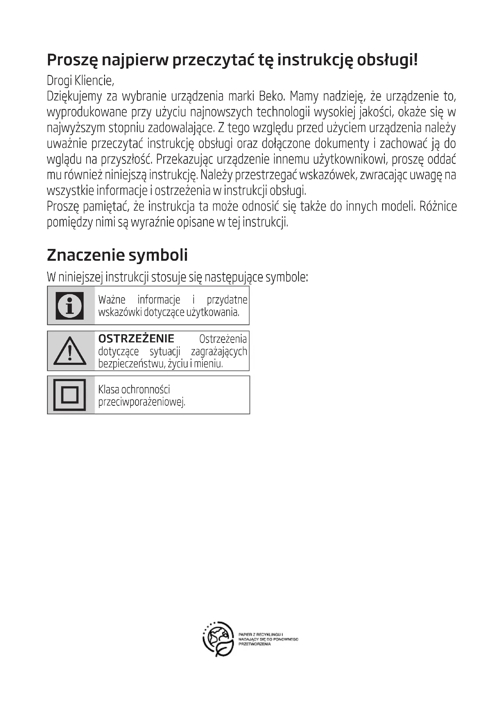 Prima di contattare l’assistenza tecnica, al fine di agevolare la gestione della chiamata, è necessario avere a portata di mano il modello del prodotto e il documento fiscale di acquisto.Proszę najpierw przeczytać tę instrukcję obsługi! Drogi Kliencie, Dziękujemy za wybranie urządzenia marki Beko. Mamy nadzieję, że urządzenie to, wyprodukowane przy użyciu najnowszych technologii wysokiej jakości, okaże się w najwyższym stopniu zadowalające. Z tego względu przed użyciem urządzenia należy uważnie przeczytać instrukcję obsługi oraz dołączone dokumenty i zachować ją do wglądu na przyszłość. Przekazując urządzenie innemu użytkownikowi, proszę oddać mu również niniejszą instrukcję. Należy przestrzegać wskazówek, zwracając uwagę na wszystkie informacje i ostrzeżenia w instrukcji obsługi. Proszę pamiętać, że instrukcja ta może odnosić się także do innych modeli. Różnice pomiędzy nimi są wyraźnie opisane w tej instrukcji. Znaczenie symboli W niniejszej instrukcji stosuje się następujące symbole: