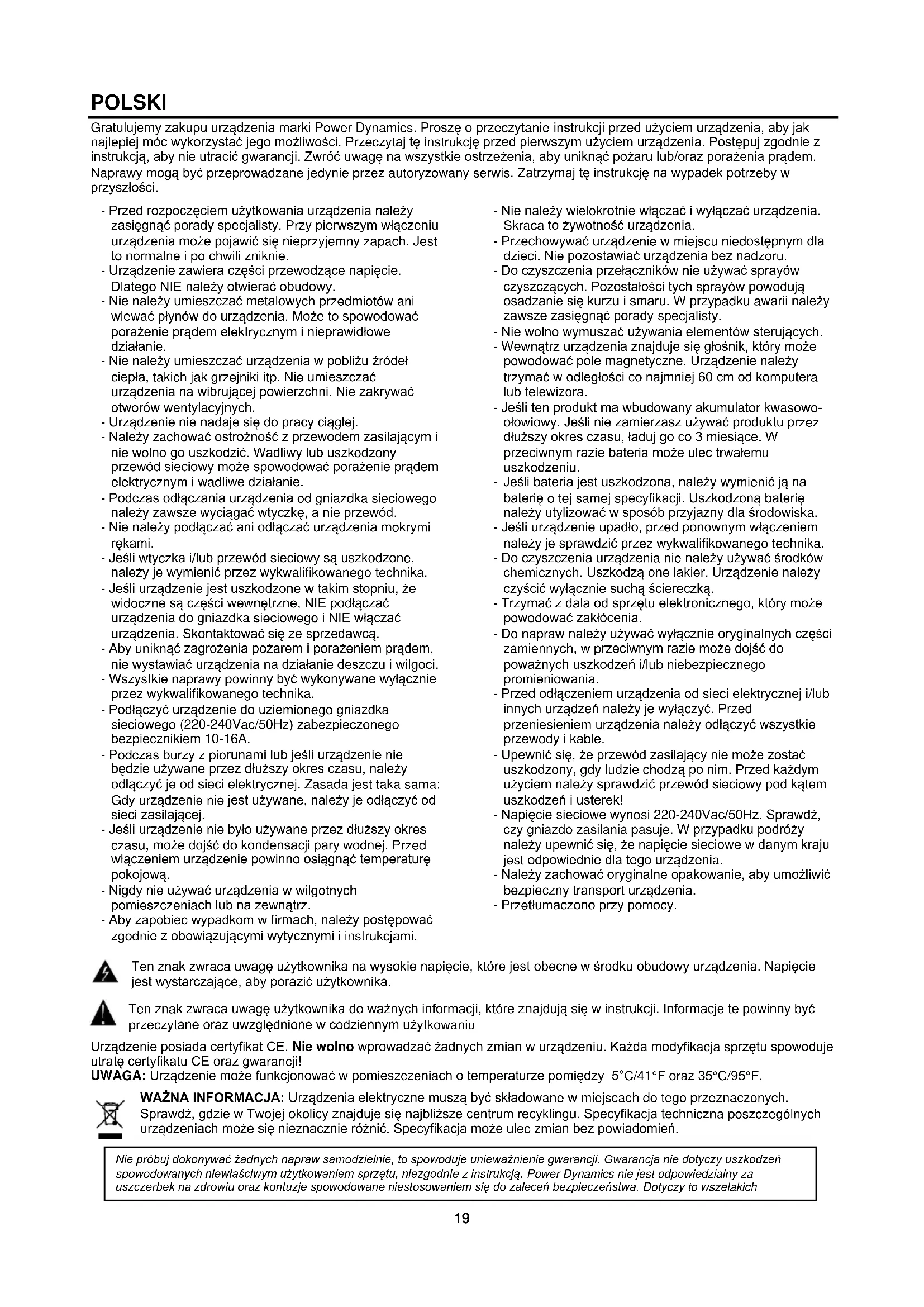 Attention : la distance BT est de 10mètres environ sans obstacle.19 POLSKI Gratulujemy zakupu urządzenia marki Power Dynamics. Proszę o przeczytanie instrukcji przed użyciem urządzenia, aby jak najlepiej móc wykorzystać jego możliwości. Przeczytaj tę instrukcję przed pierwszym użyciem urządzenia. Postępuj zgodnie z instrukcją, aby nie utracić gwarancji. Zwróć uwagę na wszystkie ostrzeżenia, aby uniknąć pożaru lub/oraz porażenia prądem. Naprawy mogą być przeprowadzane jedynie przez autoryzowany serwis. Zatrzymaj tę instrukcję na wypadek potrzeby w przyszłości. - Przed rozpoczęciem użytkowania urządzenia należy zasięgnąć porady specjalisty. Przy pierwszym włączeniu urządzenia może pojawić się nieprzyjemny zapach. Jest to normalne i po chwili zniknie. - Urządzenie zawiera części przewodzące napięcie. Dlatego NIE należy otwierać obudowy. - Nie należy umieszczać metalowych przedmiotów ani wlewać płynów do urządzenia. Może to spowodować porażenie prądem elektrycznym i nieprawidłowe działanie. - Nie należy umieszczać urządzenia w pobliżu źródeł ciepła, takich jak grzejniki itp. Nie umieszczać urządzenia na wibrującej powierzchni. Nie zakrywać otworów wentylacyjnych. - Urządzenie nie nadaje się do pracy ciągłej. - Należy zachować ostrożność z przewodem zasilającym i nie wolno go uszkodzić. Wadliwy lub uszkodzony przewód sieciowy może spowodować porażenie prądem elektrycznym i wadliwe działanie. - Podczas odłączania urządzenia od gniazdka sieciowego należy zawsze wyciągać wtyczkę, a nie przewód. - Nie należy podłączać ani odłączać urządzenia mokrymi rękami. - Jeśli wtyczka i/lub przewód sieciowy są uszkodzone, należy je wymienić przez wykwalifikowanego technika. - Jeśli urządzenie jest uszkodzone w takim stopniu, że widoczne są części wewnętrzne, NIE podłączać urządzenia do gniazdka sieciowego i NIE włączać urządzenia. Skontaktować się ze sprzedawcą. - Aby uniknąć zagrożenia pożarem i porażeniem prądem, nie wystawiać urządzenia na działanie deszczu i wilgoci. - Wszystkie naprawy powinny być wykonywane wyłącznie przez wykwalifikowanego technika. - Podłączyć urządzenie do uziemionego gniazdka sieciowego (220-240Vac/50Hz) zabezpieczonego bezpiecznikiem 10-16A. - Podczas burzy z piorunami lub jeśli urządzenie nie będzie używane przez dłuższy okres czasu, należy odłączyć je od sieci elektrycznej. Zasada jest taka sama: Gdy urządzenie nie jest używane, należy je odłączyć od sieci zasilającej. - Jeśli urządzenie nie było używane przez dłuższy okres czasu, może dojść do kondensacji pary wodnej. Przed włączeniem urządzenie powinno osiągnąć temperaturę pokojową. - Nigdy nie używać urządzenia w wilgotnych pomieszczeniach lub na zewnątrz. - Aby zapobiec wypadkom w firmach, należy postępować zgodnie z obowiązującymi wytycznymi i instrukcjami. - Nie należy wielokrotnie włączać i wyłączać urządzenia. Skraca to żywotność urządzenia. - Przechowywać urządzenie w miejscu niedostępnym dla dzieci. Nie pozostawiać urządzenia bez nadzoru. - Do czyszczenia przełączników nie używać sprayów czyszczących. Pozostałości tych sprayów powodują osadzanie się kurzu i smaru. W przypadku awarii należy zawsze zasięgnąć porady specjalisty. - Nie wolno wymuszać używania elementów sterujących. - Wewnątrz urządzenia znajduje się głośnik, który może powodować pole magnetyczne. Urządzenie należy trzymać w odległości co najmniej 60 cm od komputera lub telewizora. - Jeśli ten produkt ma wbudowany akumulator kwasowo- ołowiowy. Jeśli nie zamierzasz używać produktu przez dłuższy okres czasu, ładuj go co 3 miesiące. W przeciwnym razie bateria może ulec trwałemu uszkodzeniu. - Jeśli bateria jest uszkodzona, należy wymienić ją na baterię o tej samej specyfikacji. Uszkodzoną baterię należy utylizować w sposób przyjazny dla środowiska. - Jeśli urządzenie upadło, przed ponownym włączeniem należy je sprawdzić przez wykwalifikowanego technika. - Do czyszczenia urządzenia nie należy używać środków chemicznych. Uszkodzą one lakier. Urządzenie należy czyścić wyłącznie suchą ściereczką. - Trzymać z dala od sprzętu elektronicznego, który może powodować zakłócenia. - Do napraw należy używać wyłącznie oryginalnych części zamiennych, w przeciwnym razie może dojść do poważnych uszkodzeń i/lub niebezpiecznego promieniowania. - Przed odłączeniem urządzenia od sieci elektrycznej i/lub innych urządzeń należy je wyłączyć. Przed przeniesieniem urządzenia należy odłączyć wszystkie przewody i kable. - Upewnić się, że przewód zasilający nie może zostać uszkodzony, gdy ludzie chodzą po nim. Przed każdym użyciem należy sprawdzić przewód sieciowy pod kątem uszkodzeń i usterek! - Napięcie sieciowe wynosi 220-240Vac/50Hz. Sprawdź, czy gniazdo zasilania pasuje. W przypadku podróży należy upewnić się, że napięcie sieciowe w danym kraju jest odpowiednie dla tego urządzenia. - Należy zachować oryginalne opakowanie, aby umożliwić bezpieczny transport urządzenia. - Przetłumaczono przy pomocy. Ten znak zwraca uwagę użytkownika na wysokie napięcie, które jest obecne w środku obudowy urządzenia. Napięcie jest wystarczające, aby porazić użytkownika. Ten znak zwraca uwagę użytkownika do ważnych informacji, które znajdują się w instrukcji. Informacje te powinny być przeczytane oraz uwzględnione w codziennym użytkowaniu Urządzenie posiada certyfikat CE. Nie wolno wprowadzać żadnych zmian w urządzeniu. Każda modyfikacja sprzętu spowoduje utratę certyfikatu CE oraz gwarancji! UWAGA: Urządzenie może funkcjonować w pomieszczeniach o temperaturze pomiędzy 5°C/41°F oraz 35°C/95°F. WAŻNA INFORMACJA: Urządzenia elektryczne muszą być składowane w miejscach do tego przeznaczonych. Sprawdź, gdzie w Twojej okolic