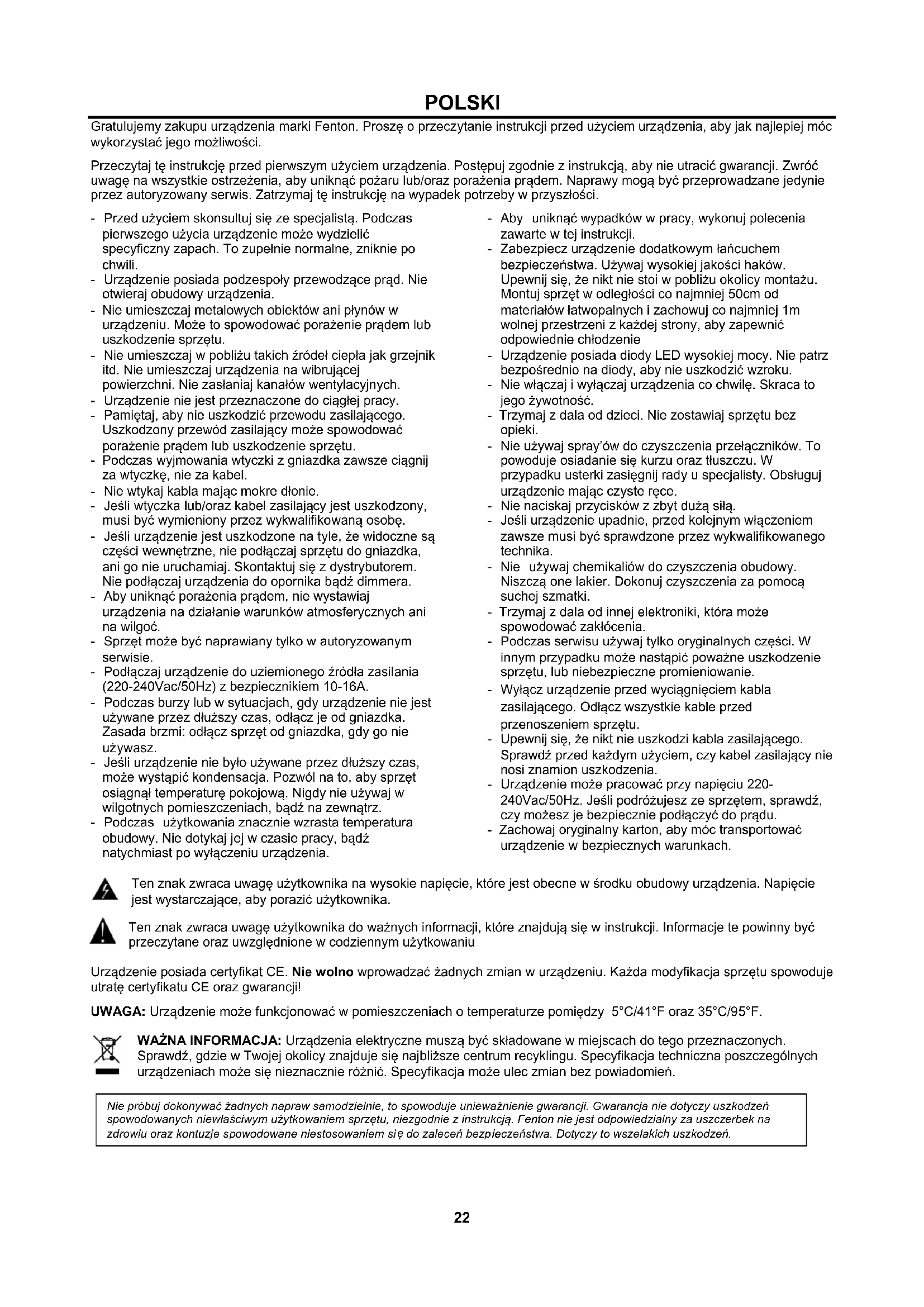 A chaque pression sur la touche Play / Pause vous passez du mode Lecture ou mode pause et inversement. En mode Lecture (Play), la touche reste allumée, elle clignote en mode Pause.22 POLSKI Gratulujemy zakupu urządzenia marki Fenton. Proszę o przeczytanie instrukcji przed użyciem urządzenia, aby jak najlepiej móc wykorzystać jego możliwości. Przeczytaj tę instrukcję przed pierwszym użyciem urządzenia. Postępuj zgodnie z instrukcją, aby nie utracić gwarancji. Zwróć uwagę na wszystkie ostrzeżenia, aby uniknąć pożaru lub/oraz porażenia prądem. Naprawy mogą być przeprowadzane jedynie przez autoryzowany serwis. Zatrzymaj tę instrukcję na wypadek potrzeby w przyszłości. - Przed użyciem skonsultuj się ze specjalistą. Podczas pierwszego użycia urządzenie może wydzielić specyficzny zapach. To zupełnie normalne, zniknie po chwili. - Urządzenie posiada podzespoły przewodzące prąd. Nie otwieraj obudowy urządzenia. - Nie umieszczaj metalowych obiektów ani płynów w urządzeniu. Może to spowodować porażenie prądem lub uszkodzenie sprzętu. - Nie umieszczaj w pobliżu takich źródeł ciepła jak grzejnik itd. Nie umieszczaj urządzenia na wibrującej powierzchni. Nie zasłaniaj kanałów wentylacyjnych. - Urządzenie nie jest przeznaczone do ciągłej pracy. - Pamiętaj, aby nie uszkodzić przewodu zasilającego. Uszkodzony przewód zasilający może spowodować porażenie prądem lub uszkodzenie sprzętu. - Podczas wyjmowania wtyczki z gniazdka zawsze ciągnij za wtyczkę , nie za kabel. - Nie wtykaj kabla mając mokre dłonie. - Jeśli wtyczka lub/oraz kabel zasilający jest uszkodzony, musi być wymieniony przez wykwalifikowaną osobę. - Jeśli urządzenie jest uszkodzone na tyle, że widoczne są części wewnętrzne, nie podłączaj sprzętu do gniazdka, ani go nie uruchamiaj. Skontaktuj się z dystrybutorem. Nie podłączaj urządzenia do opornika bądź dimmera. - Aby uniknąć porażenia prądem, nie wystawiaj urządzenia na działanie warunków atmosferycznych ani na wilgoć. - Sprzęt może być naprawiany tylko w autoryzowanym serwisie. - Podłączaj urządzenie do uziemionego źródła zasilania (220-240Vac/50Hz) z bezpiecznikiem 10-16A. - Podczas burzy lub w sytuacjach, gdy urządzenie nie jest używane przez dłuższy czas, odłącz je od gniazdka. Zasada brzmi: odłącz sprzęt od gniazdka, gdy go nie