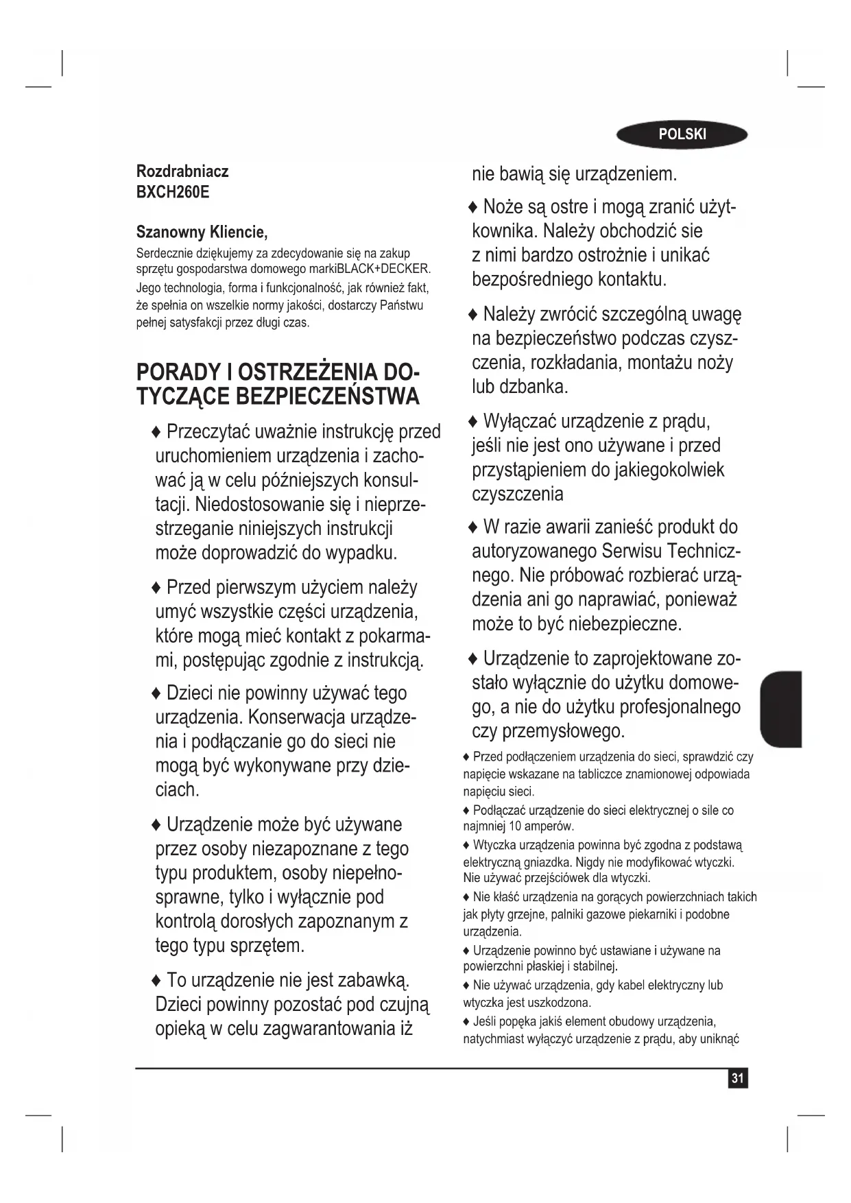 Rozdrabniacz BXCH260E Szanowny Kliencie, Serdecznie dziękujemy za zdecydowanie się na zakup sprzętu gospodarstwa domowego markiBLACK+DECKER. Jego technologia, forma i funkcjonalność, jak również fakt, że spełnia on wszelkie normy jakości, dostarczy Państwu pełnej satysfakcji przez długi czas.
