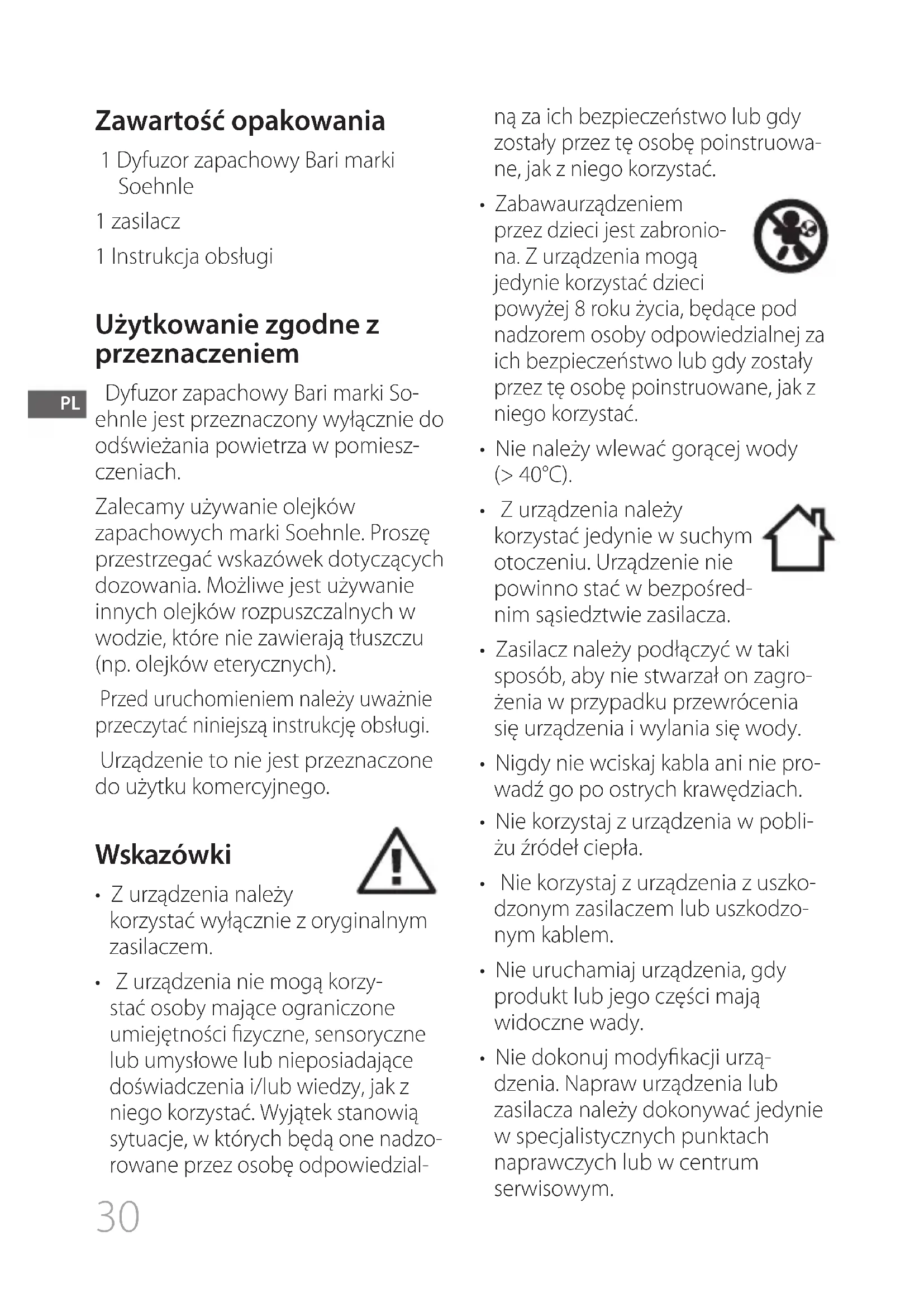 Sem Névoa Unidade de alimentação elétrica não ligada Inserir unidade de alimentação elétrica na tomada e no aparelho Água insuficiente no reservatório de água Abastecer com água até à marca máx. Demasiada água no reservatório de água Retirar água até à marca máx. A parte superior está bloqueada por uma película de água ou semelhante Limpar com um pano O reservatório de água está sujo Limpar o reservatório de água com um pano e cotonetes Dados técnicos Número de artigo 68111 Dimensões Ø 115 x 146,2 mm Tensão nominal 24V Potência nominal 9 W Capacidade do reser- vatório 80 ml Unidade de alimentação elétrica Modelo: K09S240037G Entrada: 100-240V-50/60Hz 0,5A Saída: 24,0V =0,37A PT30 Zawartość opakowania 1 Dyfuzor zapachowy Bari marki Soehnle 1 zasilacz 1 Instrukcja obsługi Użytkowanie zgodne z przeznaczeniem Dyfuzor zapachowy Bari marki So- ehnle jest przeznaczony wyłącznie do odświeżania powietrza w pomiesz- czeniach. Zalecamy używanie olejków zapachowych marki Soehnle. Proszę przestrzegać wskazówek dotyczących dozowania. Możliwe jest używanie innych olejków rozpuszczalnych w wodzie, które nie zawierają tłuszczu (np. olejków eterycznych). Przed uruchomieniem należy uważnie przeczytać niniejszą instrukcję obsługi. Urządzenie to nie jest przeznaczone do użytku komercyjnego. Wskazówki