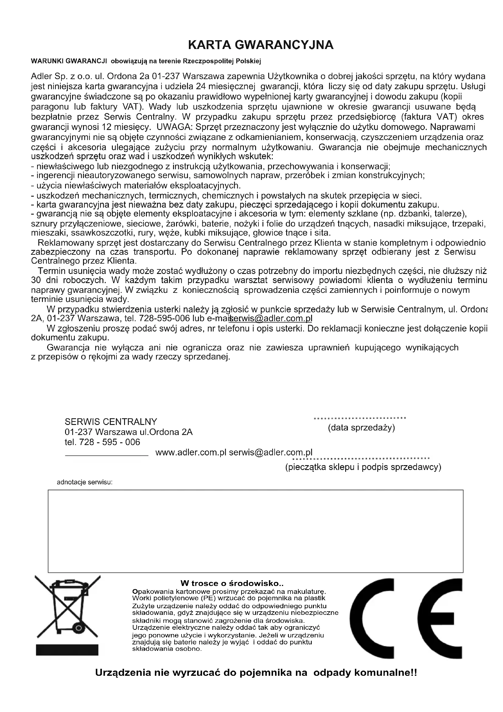 W trosce o środowisko..Opakowania kartonowe prosimy przekazać na makulaturę.Worki polietylenowe (PE) wrzucać do pojemnika na plastikZużyte urządzenie należy oddać do odpowiedniego punktu składowania, gdyż znajdujące się w urządzeniu niebezpieczne składniki mogą stanowić zagrożenie dla środowiska. Urządzenie elektryczne należy oddać tak aby ograniczyćjego ponowne użycie i wykorzystanie. Jeżeli w urządzeniuznajdują się baterie należy je wyjąć i oddać do punktu składowania osobno. KARTA GWARANCYJNA WARUNKI GWARANCJI obowiązują na terenie Rzeczpospolitej PolskiejAdler Sp. z o.o. ul. Ordona 2a 01-237 Warszawa zapewnia Użytkownika o dobrej jakości sprzętu, na który wydana jest niniejsza karta gwarancyjna i udziela 24 miesięcznej gwarancji, która liczy się od daty zakupu sprzętu. Usługi gwarancyjne świadczone są po okazaniu prawidłowo wypełnionej karty gwarancyjnej i dowodu zakupu (kopii paragonu lub faktury VAT). Wady lub uszkodzenia sprzętu ujawnione w okresie gwarancji usuwane będą bezpłatnie przez Serwis Centralny. W przypadku zakupu sprzętu przez przedsiębiorcę (faktura VAT) okres gwarancji wynosi 12 miesięcy. UWAGA: Sprzęt przeznaczony jest wyłącznie do użytku domowego. Naprawami gwarancyjnymi nie są objęte czynności związane z odkamienianiem, konserwacją, czyszczeniem urządzenia oraz części i akcesoria ulegające zużyciu przy normalnym użytkowaniu. Gwarancja nie obejmuje mechanicznych uszkodzeń sprzętu oraz wad i uszkodzeń wynikłych wskutek:- niewłaściwego lub niezgodnego z instrukcją użytkowania, przechowywania i konserwacji;- ingerencji nieautoryzowanego serwisu, samowolnych napraw, przeróbek i zmian konstrukcyjnych;- użycia niewłaściwych materiałów eksploatacyjnych. - uszkodzeń mechanicznych, termicznych, chemicznych i powstałych na skutek przepięcia w sieci.- karta gwarancyjna jest nieważna bez daty zakupu, pieczęci sprzedającego i kopii dokumentu zakupu.- gwarancją nie są objęte elementy eksploatacyjne i akcesoria w tym: elementy szklane (np. dzbanki, talerze), sznury przyłączeniowe, sieciowe, żarówki, baterie, nożyki i folie do urządzeń tnących, nasadki miksujące, trzepaki, mieszaki, ssawkoszczotki, rury, węże, kubki miksujące, głowice tnące i sita.Reklamowany sprzęt jest dostarczany do Serwisu Centralnego przez Klienta w stanie kompletnym i odpowiednio zabezpieczony na czas transportu. Po dokonanej naprawie reklamowany sprzęt odbierany jest z Serwisu Centralnego przez Klienta.Termin usunięcia wady może zostać wydłużony o czas potrzebny do importu niezbędnych części, nie dłuższy niż 30 dni roboczych. W każdym takim przypadku warsztat serwisowy powiadomi klienta o wydłużeniu terminu naprawy gwarancyjnej. W związku z koniecznością sprowadzenia części zamiennych i poinformuje o nowym terminie usunięcia wady.W przypadku stwierdzenia usterki należy ją zgłosić w punkcie sprzedaży lub w Serwisie Centralnym, ul. Ordona 2A, 01-237 Warszawa, tel. 728-595-006 lub e-mail: . W zgłoszeniu proszę podać swój adres, nr telefonu i opis usterki. Do reklamacji konieczne jest dołączenie kopii dokumentu zakupu.Gwarancja nie wyłącza ani nie ogranicza oraz nie zawiesza uprawnień kupującego wynikających z przepisów o rękojmi za wady rzeczy sprzedanej.serwis@adler.com.plSERWIS CENTRALNY01-237 Warszawa ul.Ordona 2Atel. 728 - 595 - 006 www.adler.com.pl serwis@adler.com.pl(data sprzedaży)(pieczątka sklepu i podpis sprzedawcy)adnotacje serwisu:POLSKI