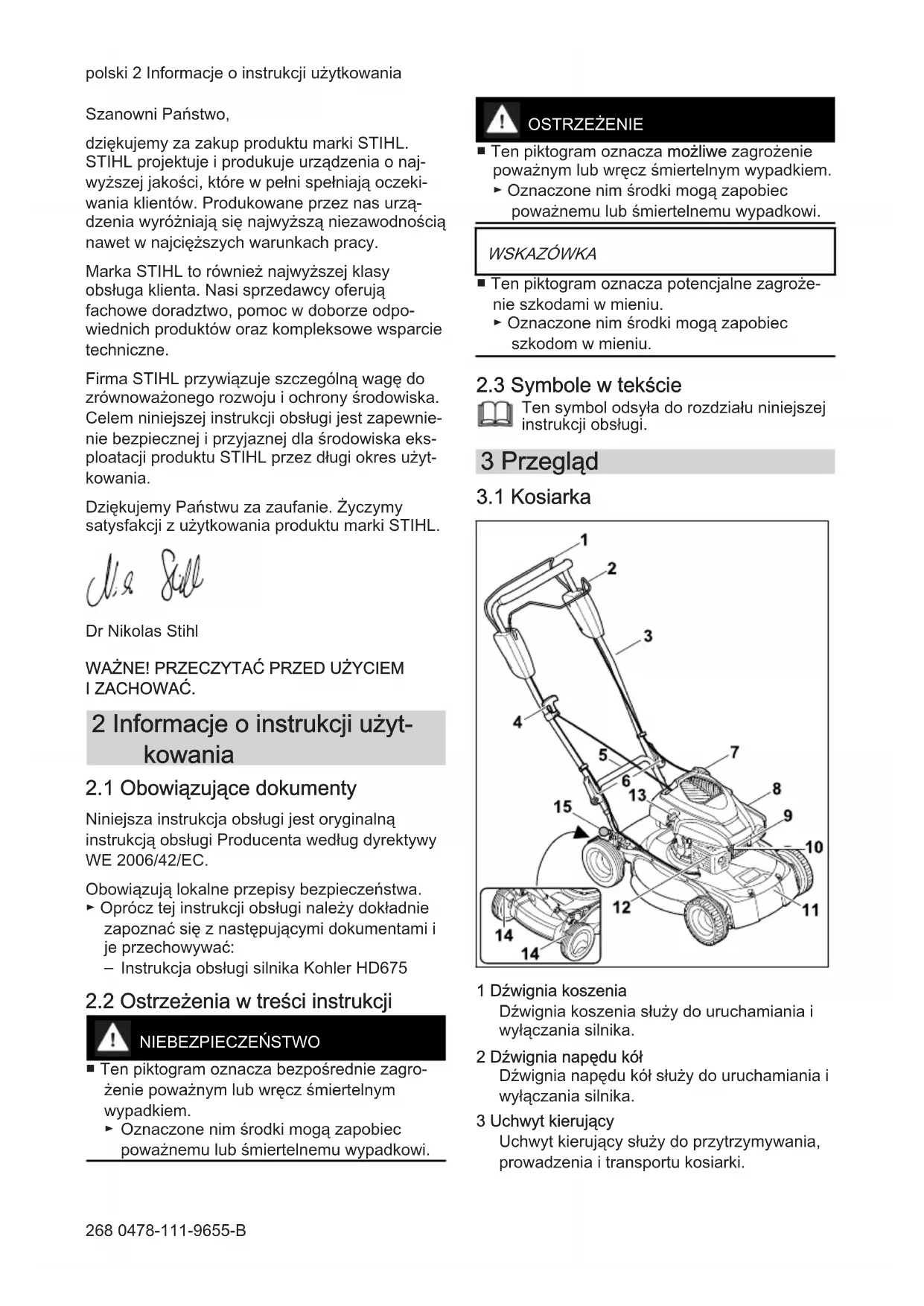 Użytkownik powinien zostać poinstruo‐ wany przez Autoryzowanego Dealera STIHL lub odpowiedniego specjalistę przed pierwszym użyciem kosiarki.
