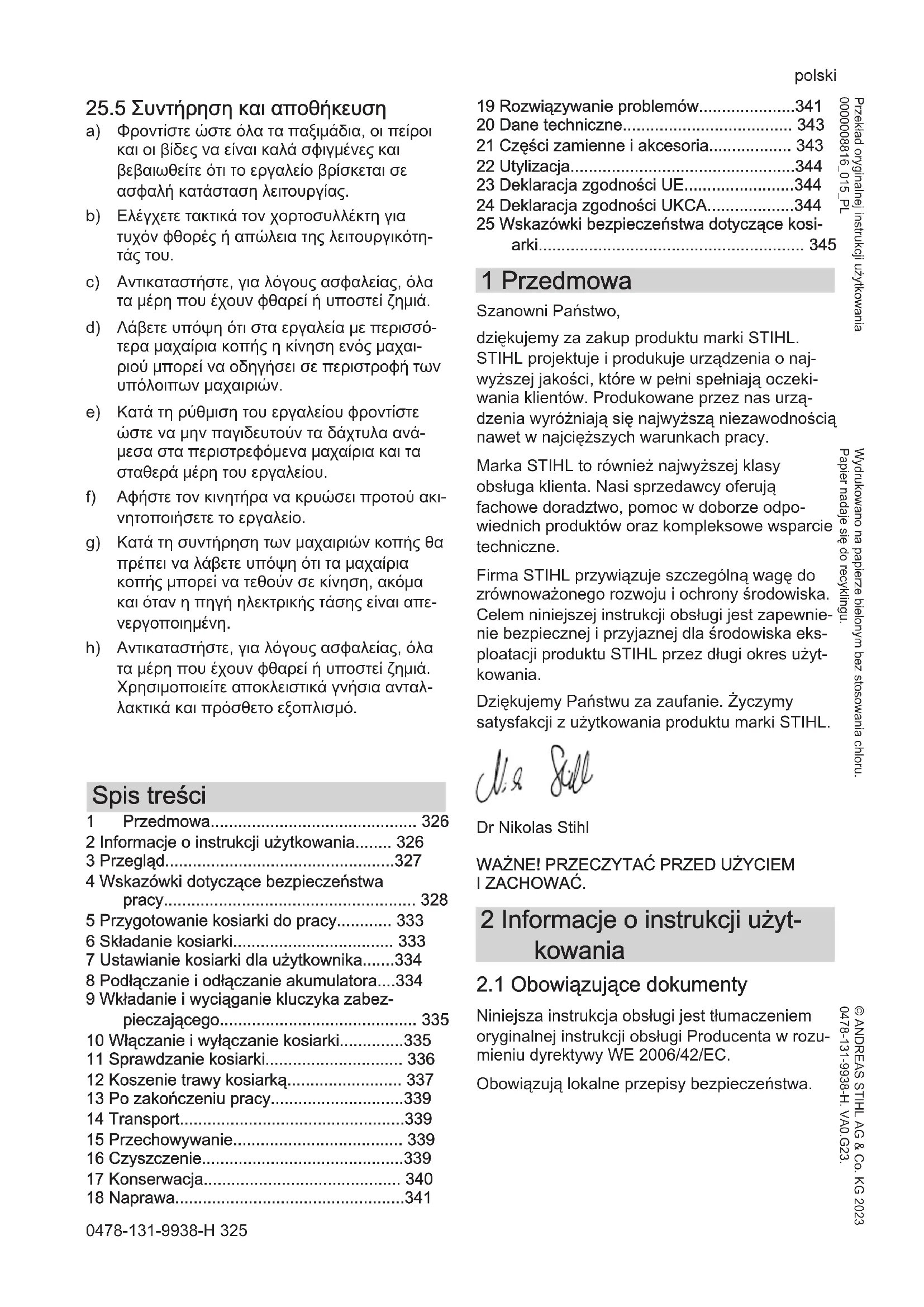 Niniejsza instrukcja obsługi jest tłumaczeniem oryginalnej instrukcji obsługi Producenta w rozu‐ mieniu dyrektywy WE 2006/42/EC. Obowiązują lokalne przepisy bezpieczeństwa. polski 0478-131-9938-H 325 © ANDREAS STIHL AG & Co. KG 2023 0478-131-9938-H. VA0.G23. Wydrukowano na papierze bielonym bez stosowania chloru. Papier nadaje się do recyklingu. Przekład oryginalnej instrukcji użytkowania 0000008816_015_PL► Oprócz tej instrukcji obsługi należy dokładnie zapoznać się z następującymi dokumentami i je przechowywać: