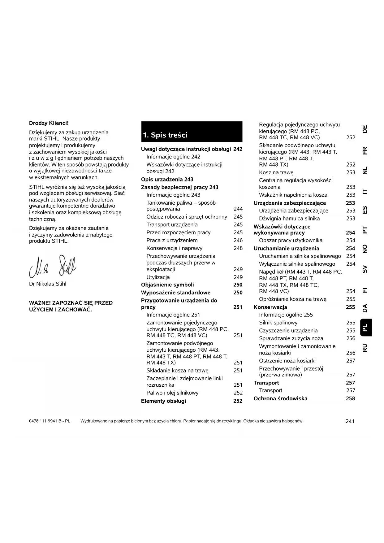 Uwagi dotyczące instrukcji obsługi 242 Informacje ogólne 242 Wskazówki dotyczące instrukcji obsługi 242 Opis urządzenia 243 Zasady bezpiecznej pracy 243 Informacje ogólne 243 Tankowanie paliwa – sposób postępowania 244 Odzież robocza i sprzęt ochronny 245 Transport urządzenia 245 Przed rozpoczęciem pracy 245 Praca z urządzeniem 246 Konserwacja i naprawy 248 Przechowywanie urządzenia podczas dłuższych przerw w eksploatacji 249 Utylizacja 249 Objaśnienie symboli 250 Wyposażenie standardowe 250 Przygotowanie urządzenia do pracy 251 Informacje ogólne 251 Zamontowanie pojedynczego uchwytu kierującego (RM 448 PC, RM 448 TC, RM 448 VC) 251 Zamontowanie podwójnego uchwytu kierującego (RM 443, RM 443 T, RM 448 PT, RM 448 T, RM 448 TX) 251 Składanie kosza na trawę 251 Zaczepianie i zdejmowanie linki rozrusznika 251 Paliwo i olej silnikowy 252 Elementy obsługi 252 Regulacja pojedynczego uchwytu kierującego (RM 448 PC, RM 448 TC, RM 448 VC) 252 Składanie podwójnego uchwytu kierującego (RM 443, RM 443 T, RM 448 PT, RM 448 T, RM 448 TX) 252 Kosz na trawę 253 Centralna regulacja wysokości koszenia 253 Wskaźnik napełnienia kosza 253 Urządzenia zabezpieczające 253 Urządzenia zabezpieczające 253 Dźwignia hamulca silnika 253 Wskazówki dotyczące wykonywania pracy 254 Obszar pracy użytkownika 254 Uruchamianie urządzenia 254 Uruchamianie silnika spalinowego 254 Wyłączanie silnika spalinowego 254 Napęd kół (RM 443 T, RM 448 PC, RM 448 PT, RM 448 T, RM 448 TX, RM 448 TC, RM 448 VC) 254 Opróżnianie kosza na trawę 255 Konserwacja 255 Informacje ogólne 255 Silnik spalinowy 255 Czyszczenie urządzenia 255 Sprawdzanie zużycia noża256 Wymontowanie i zamontowanie noża kosiarki 256 Ostrzenie noża kosiarki 257 Przechowywanie i przestój (przerwa zimowa) 257 Transport 257 Transport 257 Ochrona środowiska 2580478 111 9941 B - PL