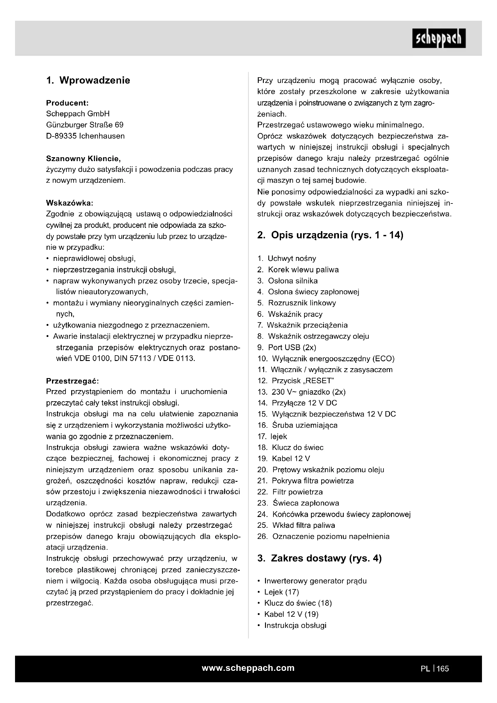 - Awarie instalacji elektrycznej w przypadku nieprze- strzegania przepisów elektrycznych oraz postano- wień VDE 0100, DIN 57113 / VDE 0113. Przestrzegać: Przed przystąpieniem do montażu i uruchomienia przeczytać cały tekst instrukcji obsługi. Instrukcja obsługi ma na celu ułatwienie zapoznania się z urządzeniem i wykorzystania możliwości użytko- wania go zgodnie z przeznaczeniem. Instrukcja obsługi zawiera ważne wskazówki doty- czące bezpiecznej, fachowej i ekonomicznej pracy z niniejszym urządzeniem oraz sposobu unikania za- grożeń, oszczędności kosztów napraw, redukcji cza- sów przestoju i zwiększenia niezawodności i trwałości urządzenia. Dodatkowo oprócz zasad bezpieczeństwa zawartych w niniejszej instrukcji obsługi należy przestrzegać przepisów danego kraju obowiązujących dla eksplo- atacji urządzenia. Instrukcję obsługi przechowywać przy urządzeniu, w torebce plastikowej chroniącej przed zanieczyszcze- niem i wilgocią. Każda osoba obsługująca musi prze- czytać ją przed przystąpieniem do pracy i dokładnie jej przestrzegać.www.scheppach.com