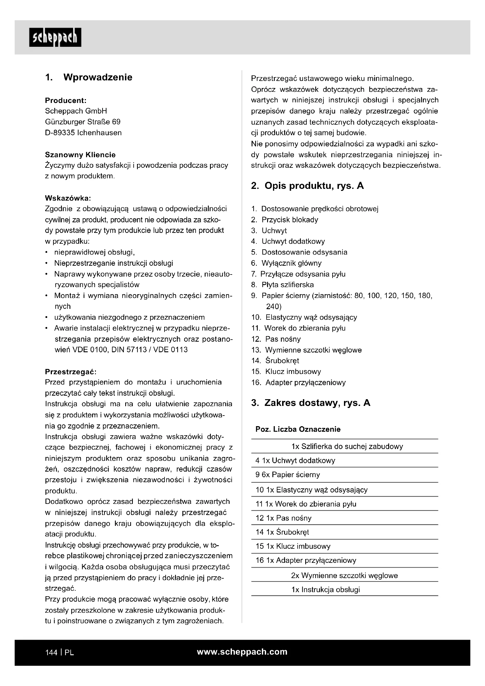 - Awarie instalacji elektrycznej w przypadku nieprze- strzegania przepisów elektrycznych oraz postano- wień VDE 0100, DIN 57113 / VDE 0113 Przestrzegać: Przed przystąpieniem do montażu i uruchomienia przeczytać cały tekst instrukcji obsługi. Instrukcja obsługi ma na celu ułatwienie zapoznania się z produktem i wykorzystania możliwości użytkowa- nia go zgodnie z przeznaczeniem. Instrukcja obsługi zawiera ważne wskazówki doty- czące bezpiecznej, fachowej i ekonomicznej pracy z niniejszym produktem oraz sposobu unikania zagro- żeń, oszczędności kosztów napraw, redukcji czasów przestoju i zwiększenia niezawodności i żywotności produktu. Dodatkowo oprócz zasad bezpieczeństwa zawartych w niniejszej instrukcji obsługi należy przestrzegać przepisów danego kraju obowiązujących dla eksplo- atacji produktu. Instrukcję obsługi przechowywać przy produkcie, w to- rebce plastikowej chroniącej przed zanieczyszczeniem i wilgocią. Każda osoba obsługująca musi przeczytać ją przed przystąpieniem do pracy i dokładnie jej prze- strzegać. Przy produkcie mogą pracować wyłącznie osoby, które zostały przeszkolone w zakresie użytkowania produk- tu i poinstruowane o związanych z tym zagrożeniach.www.scheppach.com
