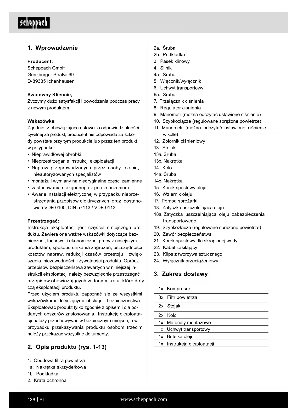 Producent: Scheppach GmbH Günzburger Straße 69 D-89335 Ichenhausen Szanowny Kliencie, Życzymy dużo satysfakcji i powodzenia podczas pracy z nowym produktem. Wskazówka: Zgodnie z obowiązującą ustawą o odpowiedzialności cywilnej za produkt, producent nie odpowiada za szko- dy powstałe przy tym produkcie lub przez ten produkt w przypadku:
