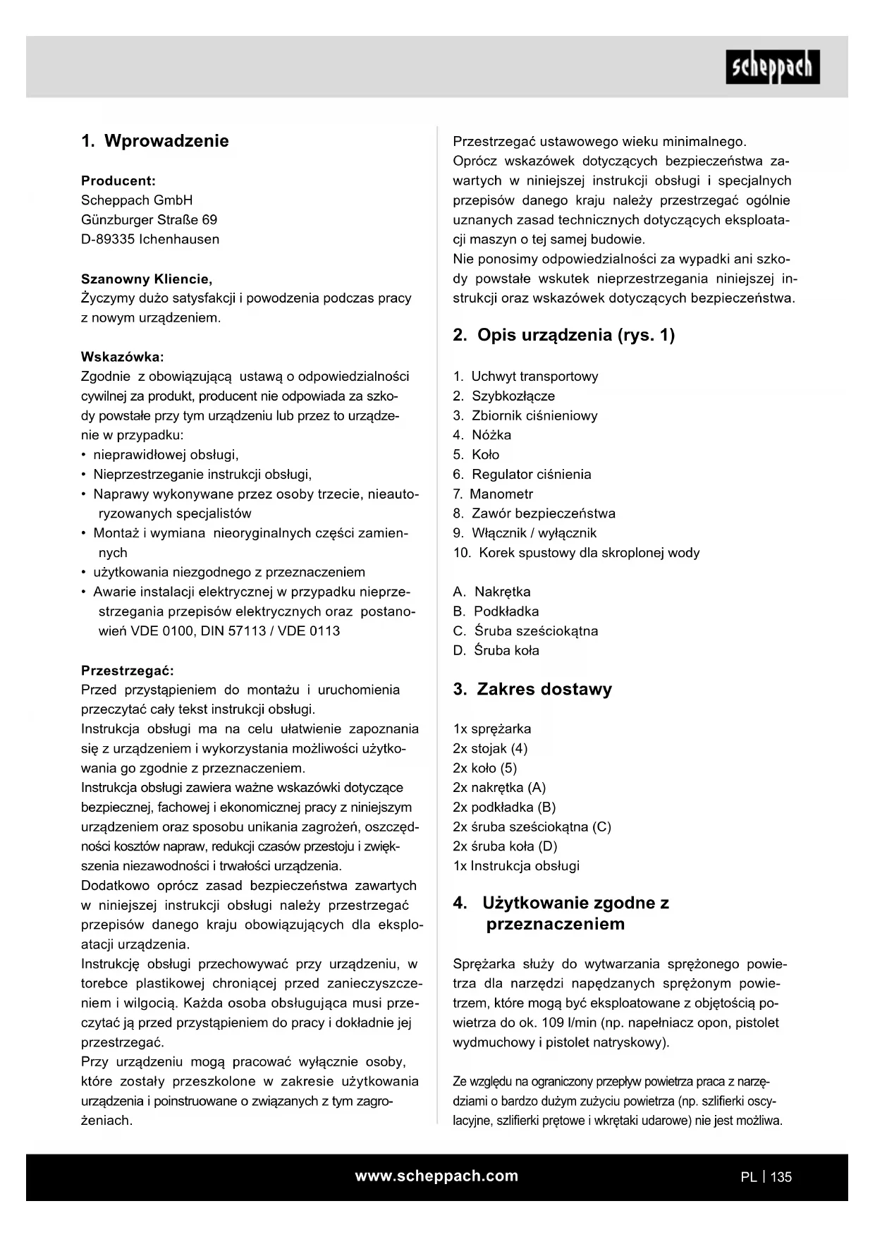 Producent: Scheppach GmbH Günzburger Straße 69 D-89335 Ichenhausen Szanowny Kliencie, Życzymy dużo satysfakcji i powodzenia podczas pracy z nowym urządzeniem. Wskazówka: Zgodnie z obowiązującą ustawą o odpowiedzialności cywilnej za produkt, producent nie odpowiada za szko- dy powstałe przy tym urządzeniu lub przez to urządze- nie w przypadku: