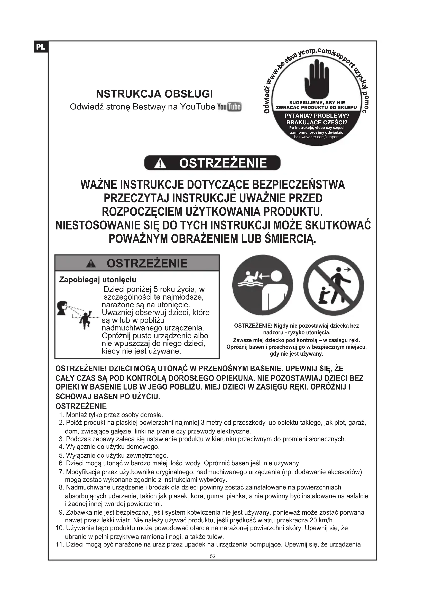 ROZPOCZĘCIEM UŻYTKOWANIA PRODUKTU. NIESTOSOWANIE SIĘ DO TYCH INSTRUKCJI MOŻE SKUTKOWAĆ POWAŻNYM OBRAŻENIEM LUB ŚMIERCIĄ. OSTRZEŻENIE OSTRZEŻENIE! DZIECI MOGĄ UTONĄĆ W PRZENOŚNYM BASENIE. UPEWNIJ SIĘ, ŻECAŁY CZAS SĄ POD KONTROLĄ DOROSŁEGO OPIEKUNA. NIE POZOSTAWIAJ DZIECI BEZ OPIEKI W BASENIE LUB W JEGO POBLIŻU. MIEJ DZIECI W ZASIĘGU RĘKI. OPRÓŻNIJ I SCHOWAJ BASEN PO UŻYCIU.OSTRZEŻENIE 1. Montaż tylko przez osoby dorosłe. 2. Połóż produkt na płaskiej powierzchni najmniej 3 metry od przeszkody lub obiektu takiego, jak płot, garaż, dom, zwisające gałęzie, linki na pranie czy przewody elektryczne. 3. Podczas zabawy zaleca się ustawienie produktu w kierunku przeciwnym do promieni słonecznych. 4. Wyłącznie do użytku domowego. 5. Wyłącznie do użytku zewnętrznego. 6. Dzieci mogą utonąć w bardzo małej ilości wody. Opróżnić basen jeśli nie używany. 7. Modyfikacje przez użytkownika oryginalnego, nadmuchiwanego urządzenia (np. dodawanie akcesoriów) mogą zostać wykonane zgodnie z instrukcjami wytwórcy. 8. Nadmuchiwane urządzenie i brodzik dla dzieci powinny zostać zainstalowane na powierzchniach absorbujących uderzenie, takich jak piasek, kora, guma, pianka, a nie powinny być instalowane na asfalcie i żadnej innej twardej powierzchni. 9. Zabawka nie jest bezpieczna, jeśli system kotwiczenia nie jest używany, ponieważ może zostać porwana nawet przez lekki wiatr. Nie należy używać produktu, jeśli prędkość wiatru przekracza 20 km/h.10. Używanie tego produktu może powodować otarcia na narażonej powierzchni skóry. Upewnij się, że ubranie w pełni przykrywa ramiona i nogi, a także tułów.11. Dzieci mogą być narażone na uraz przez upadek na urządzenia pompujące. Upewnij się, że urządzenia Zapobiegaj utonięciuDzieci poniżej 5 roku życia, w szczególności te najmłodsze, narażone są na utonięcie. Uważniej obserwuj dzieci, które są w lub w pobliżu nadmuchiwanego urządzenia. Opróżnij puste urządzenie albo nie wpuszczaj do niego dzieci, kiedy nie jest używane. OSTRZEŻENIE OSTRZEŻENIE: Nigdy nie pozostawiaj dziecka bez nadzoru - ryzyko utonięcia.Zawsze miej dziecko pod kontrolą – w zasięgu ręki.Opróżnij basen i przechowuj go w bezpiecznym miejscu, gdy nie jest używany. pompujące znajdują się co najmniej 2,5m od zabawki.