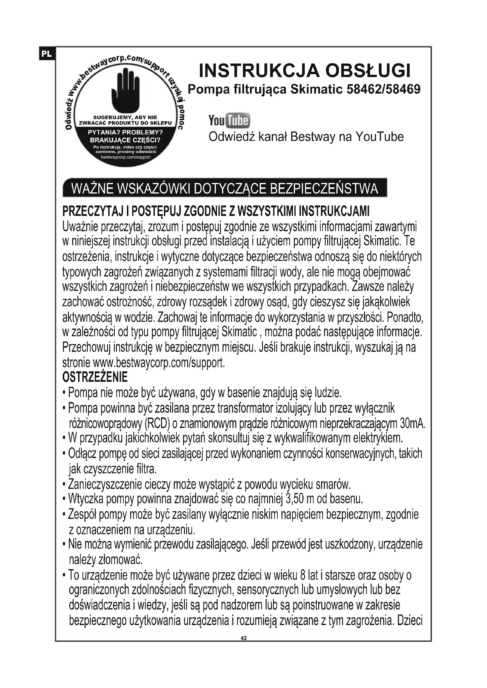 Pompa filtrująca Skimatic 58462/58469 PRZECZYTAJ I POSTĘPUJ ZGODNIE Z WSZYSTKIMI INSTRUKCJAMI Uważnie przeczytaj, zrozum i postępuj zgodnie ze wszystkimi informacjami zawartymi w niniejszej instrukcji obsługi przed instalacją i użyciem pompy filtrującej Skimatic. Te ostrzeżenia, instrukcje i wytyczne dotyczące bezpieczeństwa odnoszą się do niektórych typowych zagrożeń związanych z systemami filtracji wody, ale nie mogą obejmować wszystkich zagrożeń i niebezpieczeństw we wszystkich przypadkach. Zawsze należy zachować ostrożność, zdrowy rozsądek i zdrowy osąd, gdy cieszysz się jakąkolwiek aktywnością w wodzie. Zachowaj te informacje do wykorzystania w przyszłości. Ponadto, w zależności od typu pompy filtrującej Skimatic , można podać następujące informacje. Przechowuj instrukcję w bezpiecznym miejscu. Jeśli brakuje instrukcji, wyszukaj ją na stronie www.bestwaycorp.com/support. OSTRZEŻENIE
