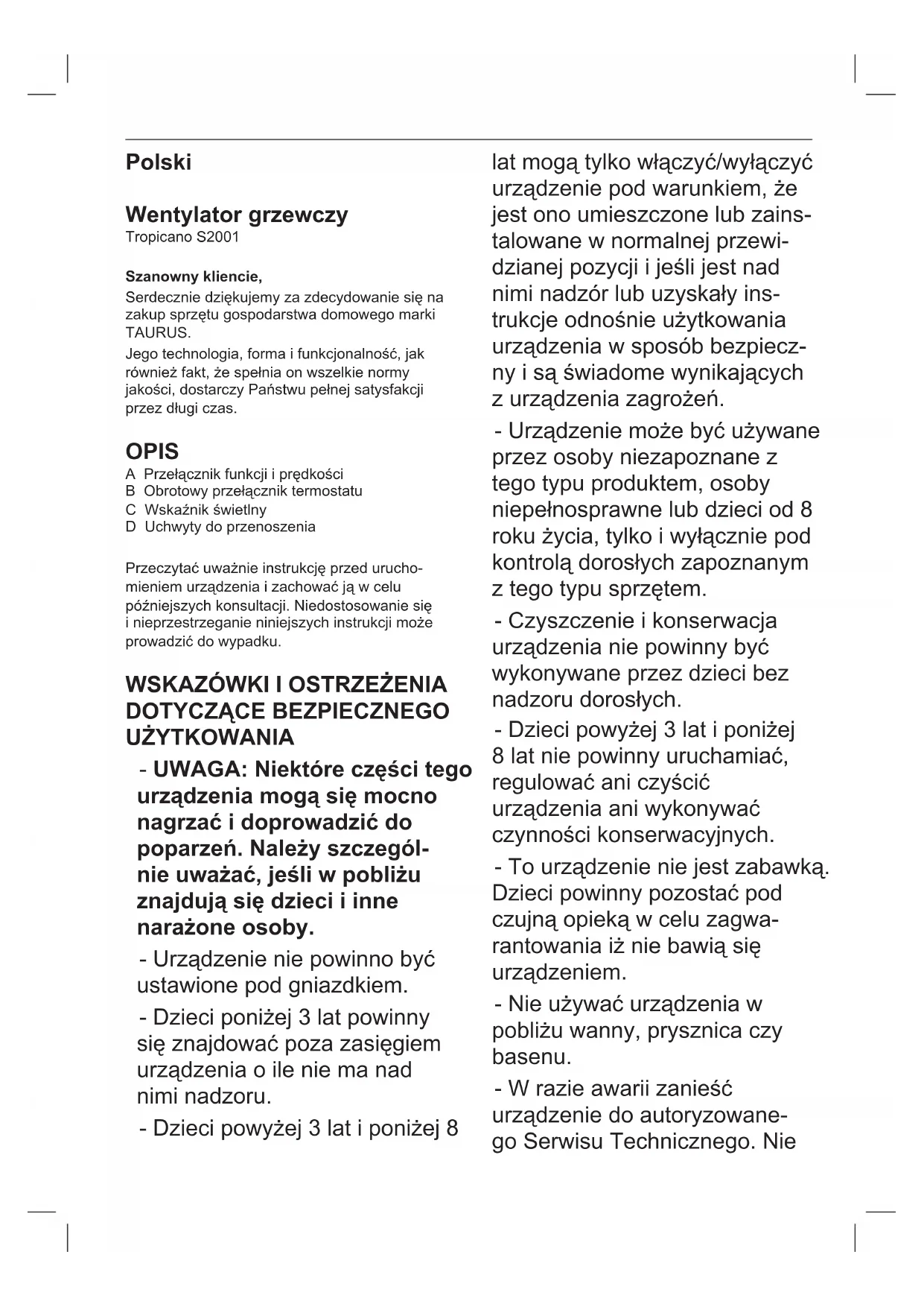 INSTRUKCJA OBSŁUGI Tropicano S2001 TAURUS