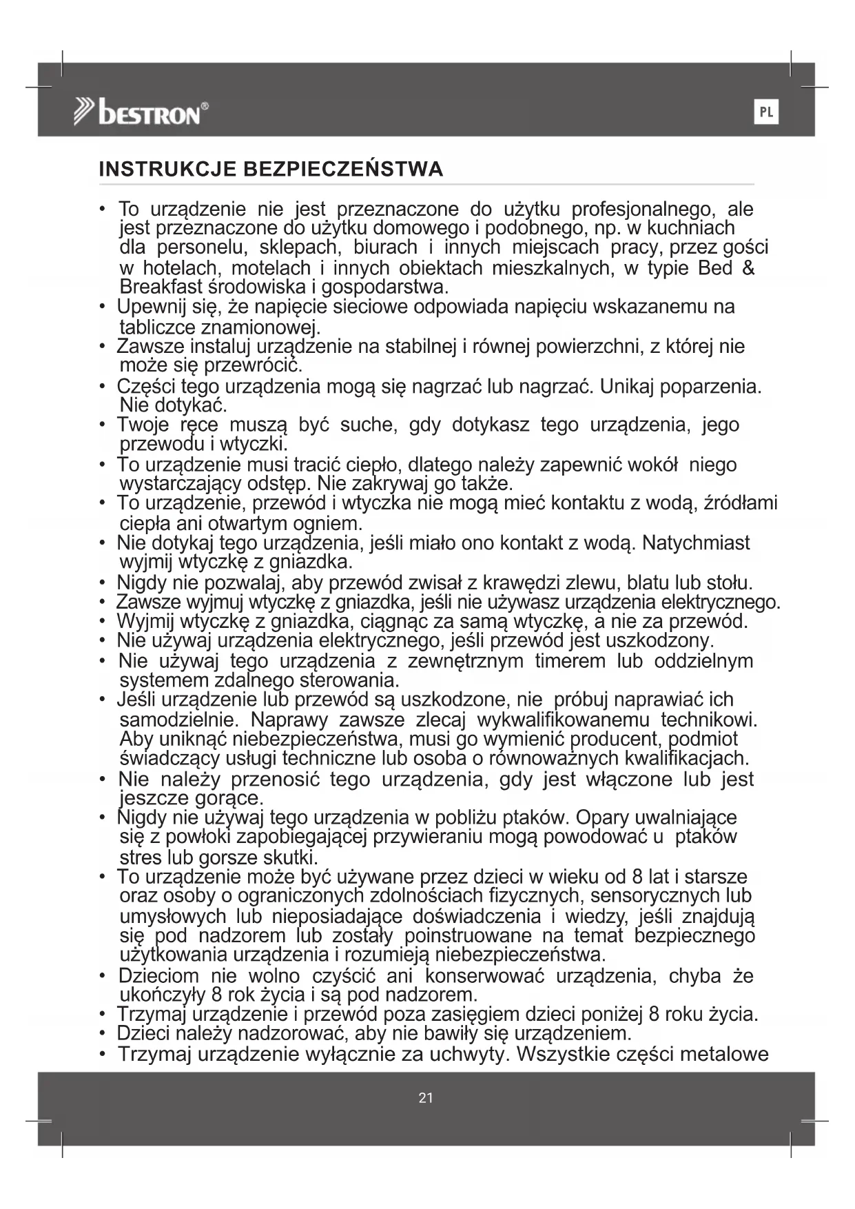 - Twoja gmina może poinformować Cię, gdzie w Twojej okolicy znaleźć wyznaczony punkt zbiórki odpadów. PRACA W mało prawdopodobnym przypadku awarii należy skontaktować się z obsługą klienta Bestron: www.bestron.com/service Specyfikacja techniczna Model ARG1200CO Zasilanie (V) 220-240V Częstotliwość (Hz) 50/60 Klasa bezpieczeństwa 1 Moc (W) 1200-1400 Hałas (dB(A)) - Maks. Pojemność - Maksymalny ciągły czas pracy (KB) - Wymiary (dł. x szer. x wys.) (cm) 47,5x22,5x14 Długość kabla (cm) 100PL