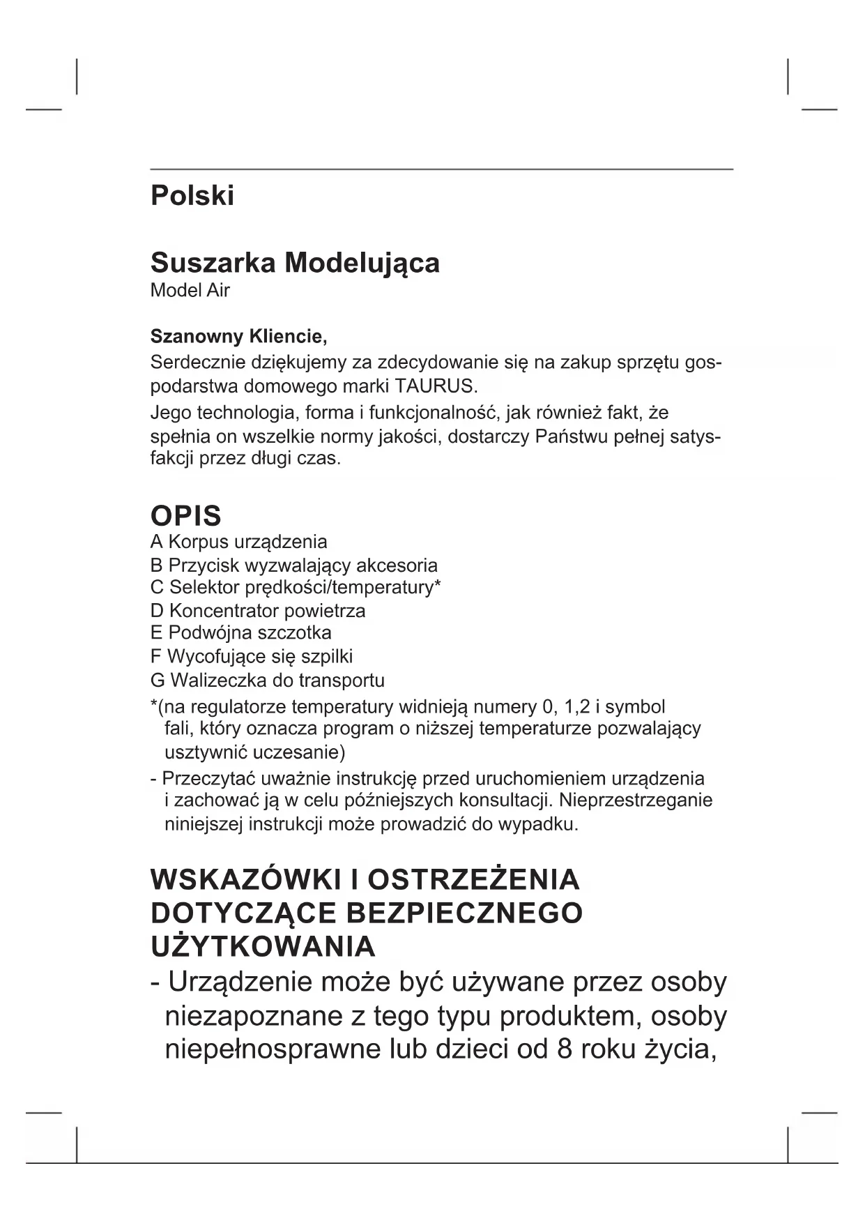 Model Air - Suszarka do włosów TAURUS - Bezpłatna instrukcja obsługi