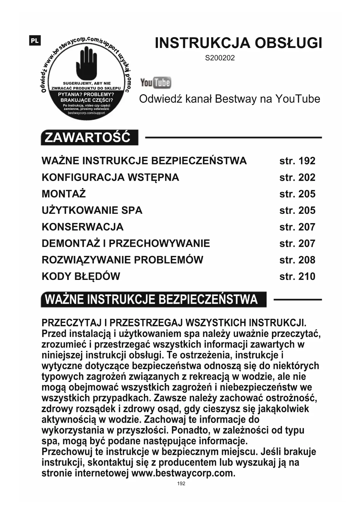 www.bestwaycorp.com. Обнаружен электрический ток от заземляющего проводаWAŻNE INSTRUKCJE BEZPIECZEŃSTWA PRZECZYTAJ I PRZESTRZEGAJ WSZYSTKICH INSTRUKCJI. Przed instalacją i użytkowaniem spa należy uważnie przeczytać, zrozumieć i przestrzegać wszystkich informacji zawartych w niniejszej instrukcji obsługi. Te ostrzeżenia, instrukcje i wytyczne dotyczące bezpieczeństwa odnoszą się do niektórych typowych zagrożeń związanych z rekreacją w wodzie, ale nie mogą obejmować wszystkich zagrożeń i niebezpieczeństw we wszystkich przypadkach. Zawsze należy zachować ostrożność, zdrowy rozsądek i zdrowy osąd, gdy cieszysz się jakąkolwiek aktywnością w wodzie. Zachowaj te informacje do wykorzystania w przyszłości. Ponadto, w zależności od typu spa, mogą być podane następujące informacje. Przechowuj te instrukcje w bezpiecznym miejscu. Jeśli brakuje instrukcji, skontaktuj się z producentem lub wyszukaj ją na stronie internetowej www.bestwaycorp.com.