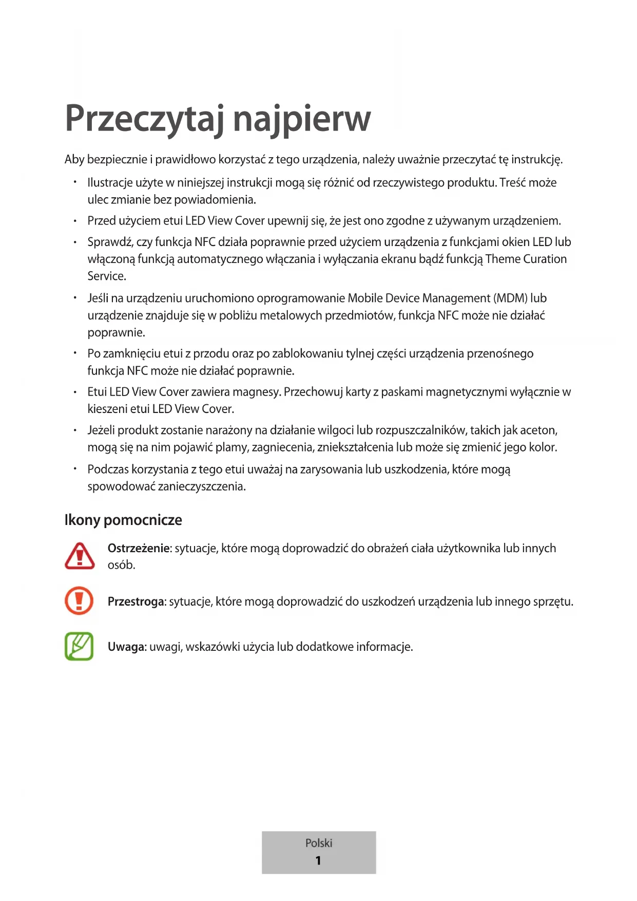 Podczas korzystania z tego etui uważaj na zarysowania lub uszkodzenia, które mogą spowodować zanieczyszczenia. Ikony pomocnicze Ostrzeżenie: sytuacje, które mogą doprowadzić do obrażeń ciała użytkownika lub innych osób. Przestroga: sytuacje, które mogą doprowadzić do uszkodzeń urządzenia lub innego sprzętu. Uwaga: uwagi, wskazówki użycia lub dodatkowe informacje. Polski