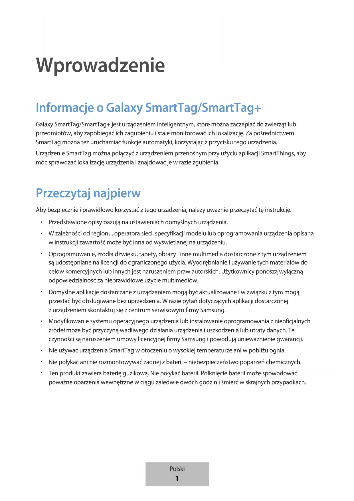 Wprowadzenie Informacje oGalaxy SmartTag/SmartTag+ Galaxy SmartTag/SmartTag+ jest urządzeniem inteligentnym, które można zaczepiać do zwierząt lub przedmiotów, aby zapobiegać ich zagubieniu istale monitorować ich lokalizację. Za pośrednictwem SmartTag można też uruchamiać funkcje automatyki, korzystając z przycisku tego urządzenia. Urządzenie SmartTag można połączyć zurządzeniem przenośnym przy użyciu aplikacji SmartThings, aby móc sprawdzać lokalizację urządzenia iznajdować je wrazie zgubienia. Przeczytaj najpierw Aby bezpiecznie i prawidłowo korzystać z tego urządzenia, należy uważnie przeczytać tę instrukcję.