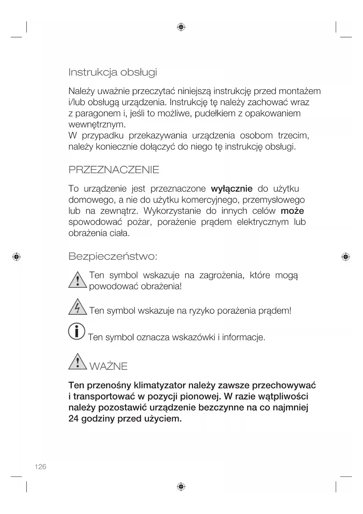 - ürünsahibininnedenolduğuhasarlariçin Bu garanti, ulusal mevzuat uyarınca müşteri olarak sahip olabileceğiniz herhangi bir yasal hakkı veya kanunlarla size verilen müşteri haklarınızı etkilemez. Garanti süresi boyunca, bir garanti durumunda hak iddia edebilmek için müşterinin satın alma tarihini belgeleyen bir kanıt (makbuz) sunmalıdır. Garanti kapsamında hak iddiaları aşağıdaki şirkete yöneltilecektir KORONA electric GmbH, Sundern/Almanya. Müşteri Hattı: +49 2933 90284-80 E-posta service@korona-electric.de web: www.korona-electric.de satın alma tarihinden itibaren 2 yıl içinde. Garanti durumunda müşteriye cihazı masraflar kendisinden olmak üzere veya yetkili bir mağazada tamir ettirme hakkı verilir. Müşteriye başka ekstra haklar (garanti durumu nedeniyle) verilmez.126 Instrukcja obsługi Należy uważnie przeczytać niniejszą instrukcję przed montażem i/lub obsługą urządzenia. Instrukcję tę należy zachować wraz z paragonem i, jeśli to możliwe, pudełkiem z opakowaniem wewnętrznym. W przypadku przekazywania urządzenia osobom trzecim, należy koniecznie dołączyć do niego tę instrukcję obsługi. PRZEZNACZENIE To urządzenie jest przeznaczone wyłącznie do użytku domowego, a nie do użytku komercyjnego, przemysłowego lub na zewnątrz. Wykorzystanie do innych celów może spowodować pożar, porażenie prądem elektrycznym lub obrażenia ciała. Bezpieczeństwo: Ten symbol wskazuje na zagrożenia, które mogą powodować obrażenia! Ten symbol wskazuje na ryzyko porażenia prądem! Ten symbol oznacza wskazówki i informacje. WAŻNE Ten przenośny klimatyzator należy zawsze przechowywać i transportować w pozycji pionowej. W razie wątpliwości należy pozostawić urządzenie bezczynne na co najmniej 24 godziny przed użyciem.POLSKI Instrukcja obsługi
