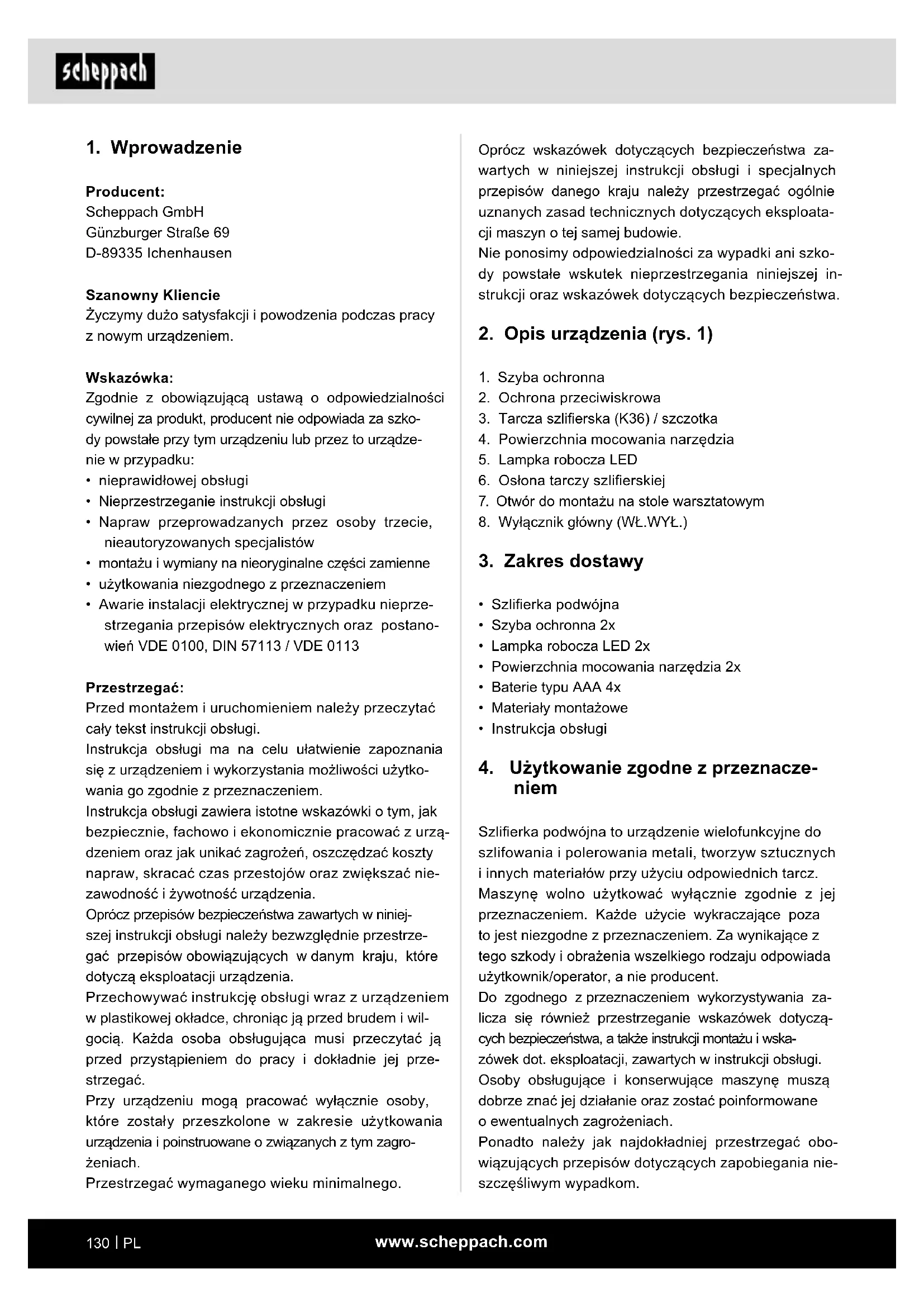 Producent: Scheppach GmbH Günzburger Straße 69 D-89335 Ichenhausen Szanowny Kliencie Życzymy dużo satysfakcji i powodzenia podczas pracy z nowym urządzeniem. Wskazówka: Zgodnie z obowiązującą ustawą o odpowiedzialności cywilnej za produkt, producent nie odpowiada za szko- dy powstałe przy tym urządzeniu lub przez to urządze- nie w przypadku: