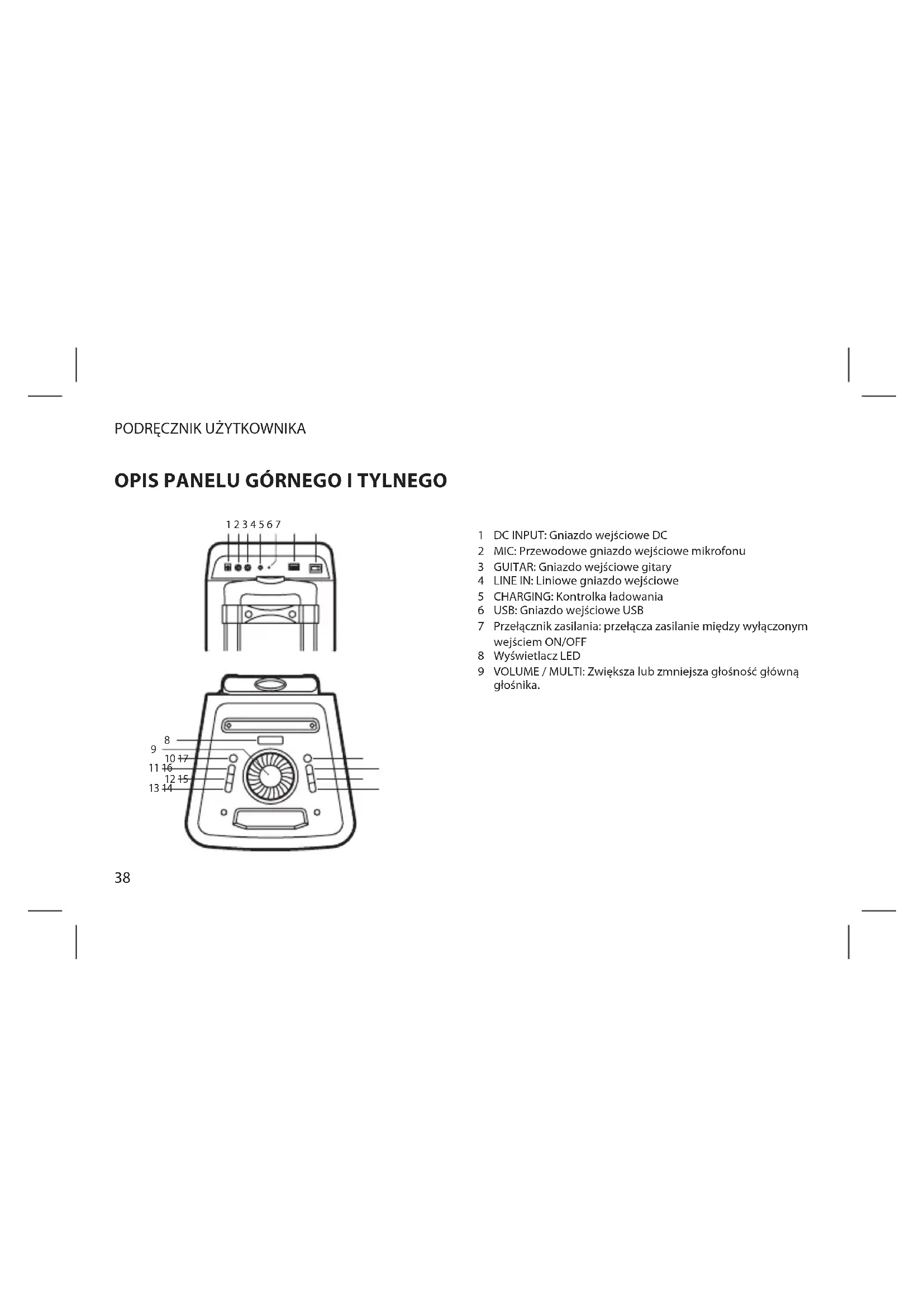 DC INPUT: Gniazdo wejściowe DC MIC: Przewodowe gniazdo wejściowe mikrofonu GUITAR: Gniazdo wejściowe gitary LINE IN: Liniowe gniazdo wejściowe CHARGING: Kontrolka ładowania USB: Gniazdo wejściowe USB Przełącznik zasilania: przełącza zasilanie między wyłączonym wejściem ON/OFF Wyświetlacz LED VOLUME / MULTI: Zwiększa lub zmniejsza głośność główną głośnika.