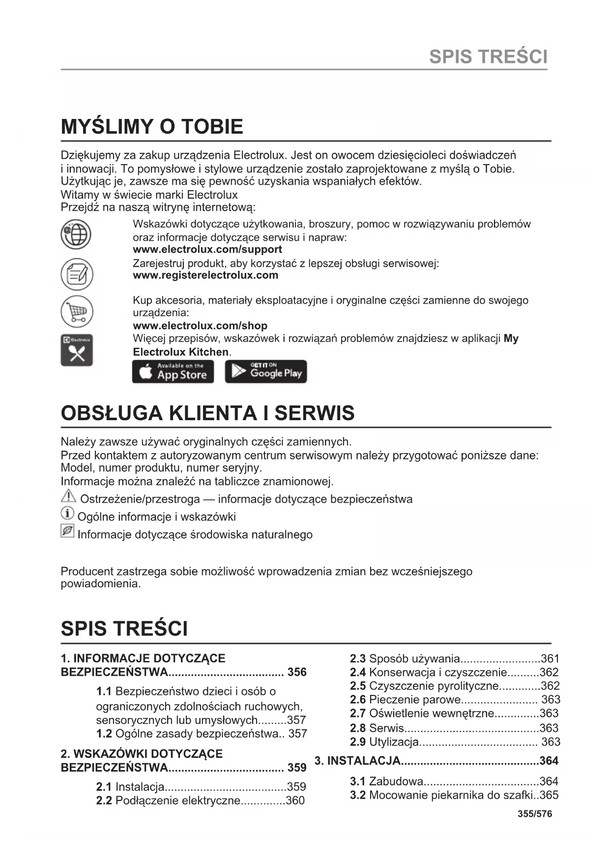 Nododiet otrreizējai pārstrādei materiālus ar simbolu . Ievietojiet iepakojuma materiālus atbilstošajos konteineros to otrreizējai pārstrādei. Palīdziet aizsargāt apkārtējo vidi un cilvēku veselību, atkārtoti pārstrādājot elektrisko un elektronisko iekārtu atkritumus. Neizmetiet ierīces, kas apzīmētas ar šo simbolu , kopā ar mājsaimniecības atkritumiem. Nododiet izstrādājumu vietējā otrreizējās pārstrādes punktā vai sazinieties ar vietējo pašvaldību. 354/576 IZVĒLNES STRUKTŪRAMYŚLIMY O TOBIE Dziękujemy za zakup urządzenia Electrolux. Jest on owocem dziesięcioleci doświadczeń i innowacji. To pomysłowe i stylowe urządzenie zostało zaprojektowane z myślą o Tobie. Użytkując je, zawsze ma się pewność uzyskania wspaniałych efektów. Witamy w świecie marki Electrolux Przejdź na naszą witrynę internetową: Wskazówki dotyczące użytkowania, broszury, pomoc w rozwiązywaniu problemów oraz informacje dotyczące serwisu i napraw: www.electrolux.com/support Zarejestruj produkt, aby korzystać z lepszej obsługi serwisowej: www.registerelectrolux.com Kup akcesoria, materiały eksploatacyjne i oryginalne części zamienne do swojego urządzenia: www.electrolux.com/shop Więcej przepisów, wskazówek i rozwiązań problemów znajdziesz w aplikacji My Electrolux Kitchen.
