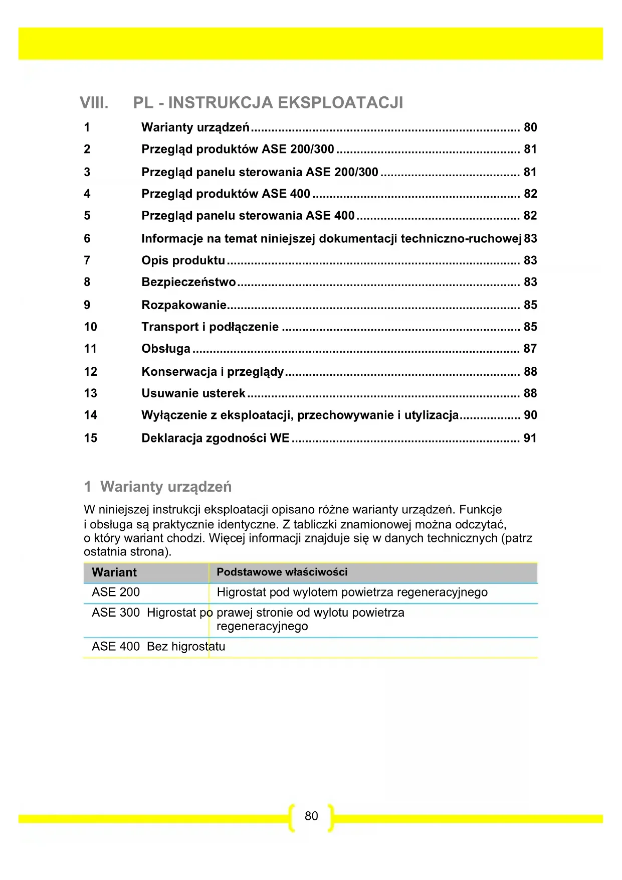 - 15 Deklaracja zgodności WE 1 Warianty urządzeń W niniejszej instrukcji eksploatacji opisano różne warianty urządzeń. Funkcje i obsługa są praktycznie identyczne. Z tabliczki znamionowej można odczytać, o który wariant chodzi. Więcej informacji znajduje się w danych technicznych (patrz ostatnia strona). Wariant Podstawowe właściwości ASE 200 Higrostat pod wylotem powietrza regeneracyjnego ASE 300 Higrostat po prawej stronie od wylotu powietrza regeneracyjnego ASE 400 Bez higrostatu81 p. 91