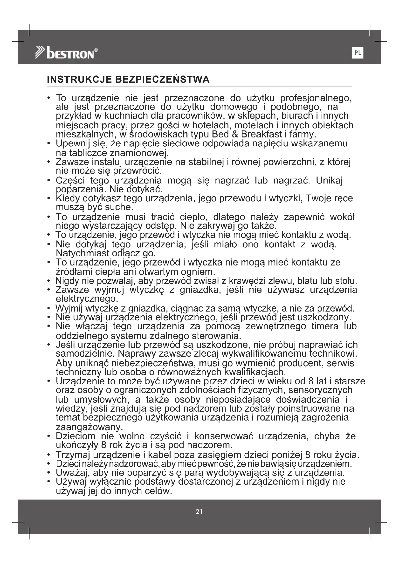 - Twoja gmina może poinformować Cię, gdzie w Twojej okolicy znaleźć wyznaczony punkt zbiórki odpadów. PRACA W mało prawdopodobnym przypadku awarii należy skontaktować się z obsługą klienta Bestron: www.bestron.com/service Specyfikacja techniczna Model ACM900BW Sieć elektryczna 220-240V~ Częstotliwość (Hz) 50/60 Klasa bezpieczeństwa 1 Moc (Watt) 1000 Hałas (dB(A)) - Pojemność max. - Maksymalny ciągły czas pracy (KB) - Wymiary (L x B x H) (cm) 24,6x16,6x34,2 Długość kabla (cm) 93PL