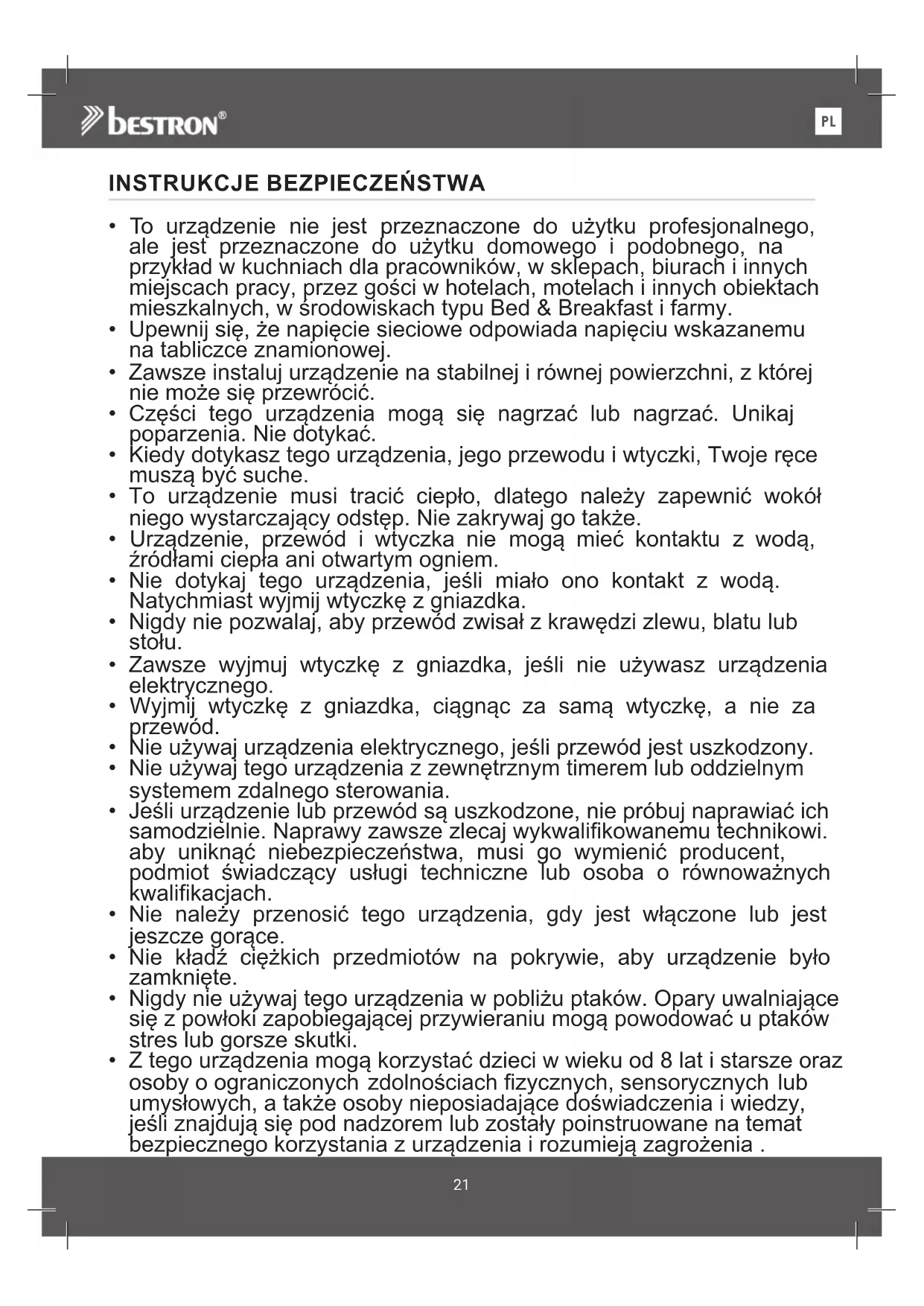 W mało prawnopodobnym przypadku awarii sąȩ z skontaktuć są z obstęga klienza Bestron: www.bestron.com/service