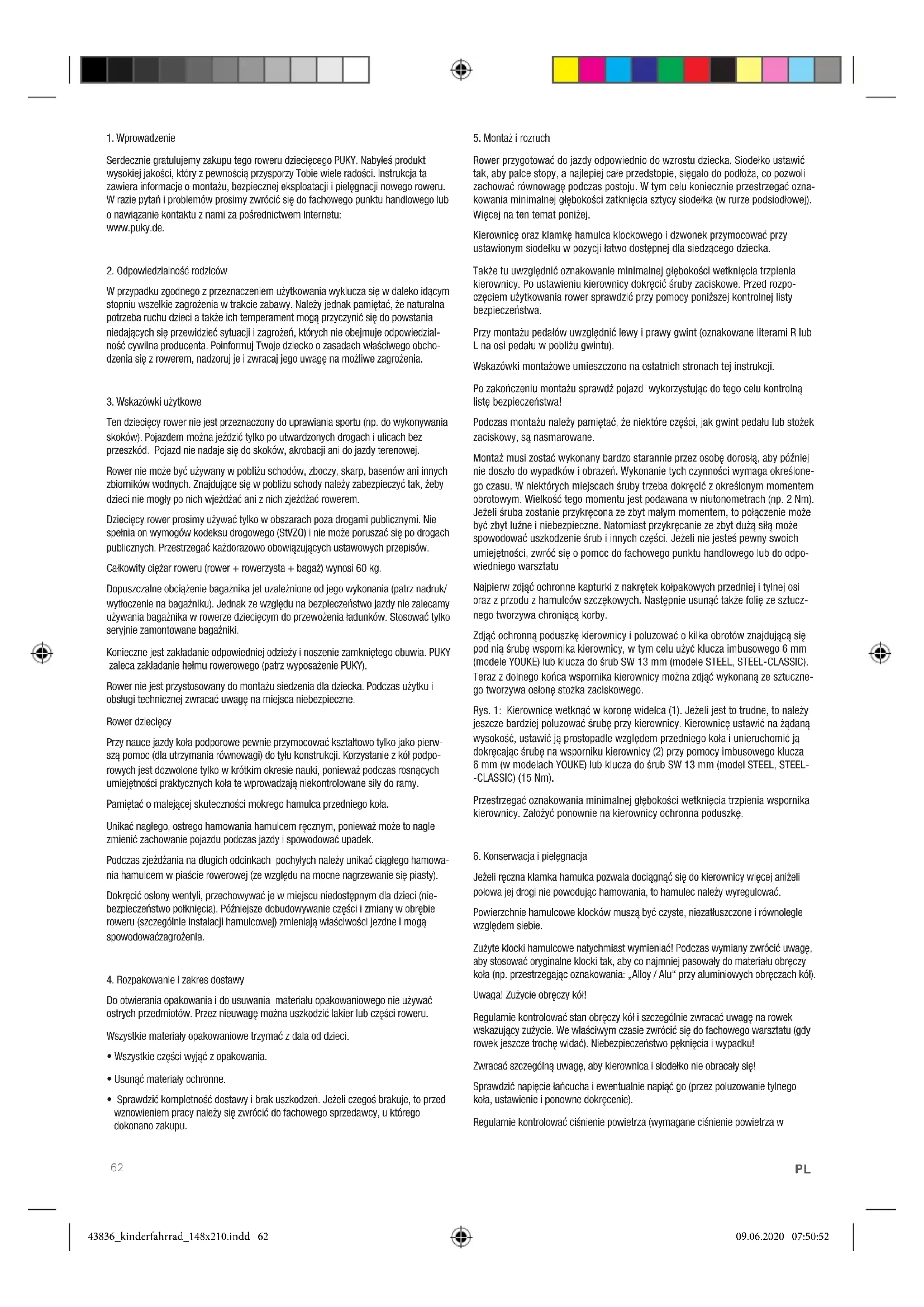 Serdecznie gratulujemy zakupu tego roweru dziecięcego PUKY. Nabyłeś produkt wysokiej jakości, który z pewnością przysporzy Tobie wiele radości. Instrukcja ta zawiera informacje o montażu, bezpiecznej eksploatacji i pielęgnacji nowego roweru. W razie pytań i problemów prosimy zwrócić się do fachowego punktu handlowego lub o nawiązanie kontaktu z nami za pośrednictwem Internetu: www.puky.de.