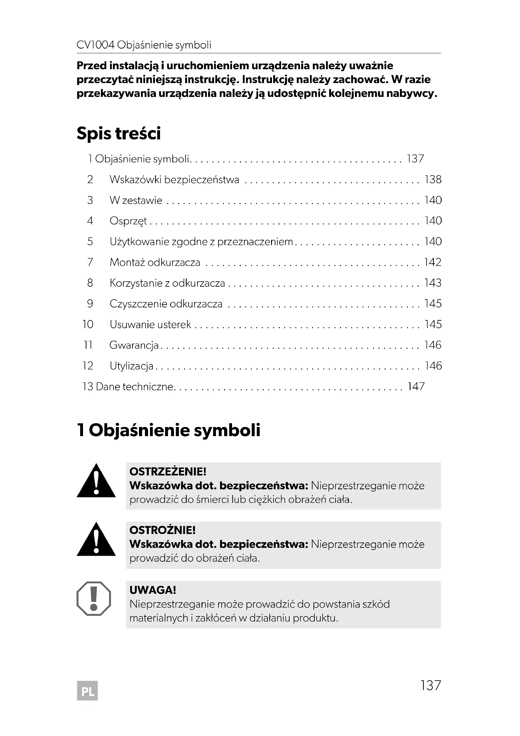 - Przed instalacją i uruchomieniem urządzenia należy uważnie przeczytać niniejszą instrukcję. Instrukcję należy zachować. W razie przekazywania urządzenia należy ją udostępnić kolejnemu nabywcy. Spis treści 1 Objaśnienie symboli p. 137