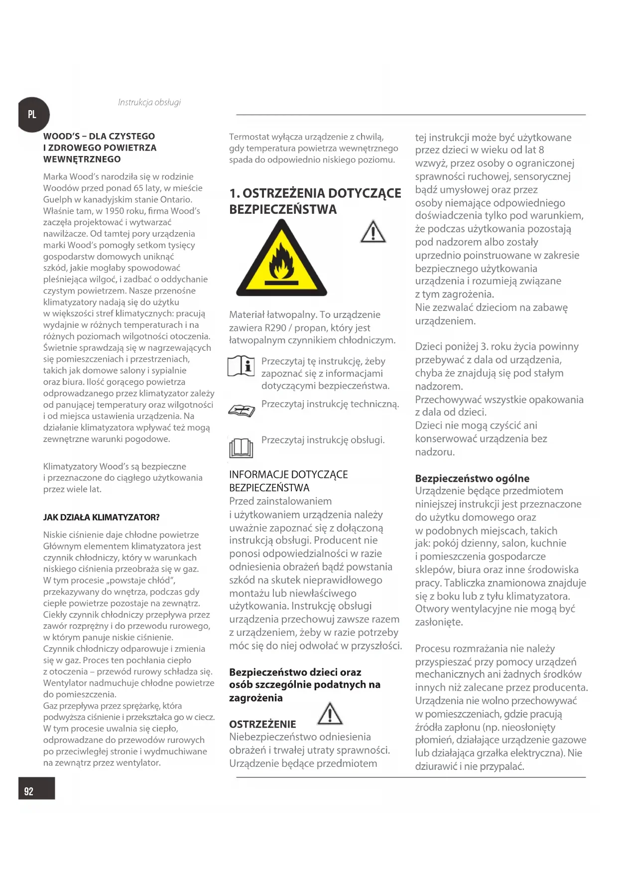 BEZPIECZEŃSTWA Materiał łatwopalny. To urządzenie zawiera R290 / propan, który jest łatwopalnym czynnikiem chłodniczym. Przeczytaj tę instrukcję, żeby zapoznać się zinformacjami dotyczącymi bezpieczeństwa. Przeczytaj instrukcję techniczną. Przeczytaj instrukcję obsługi.