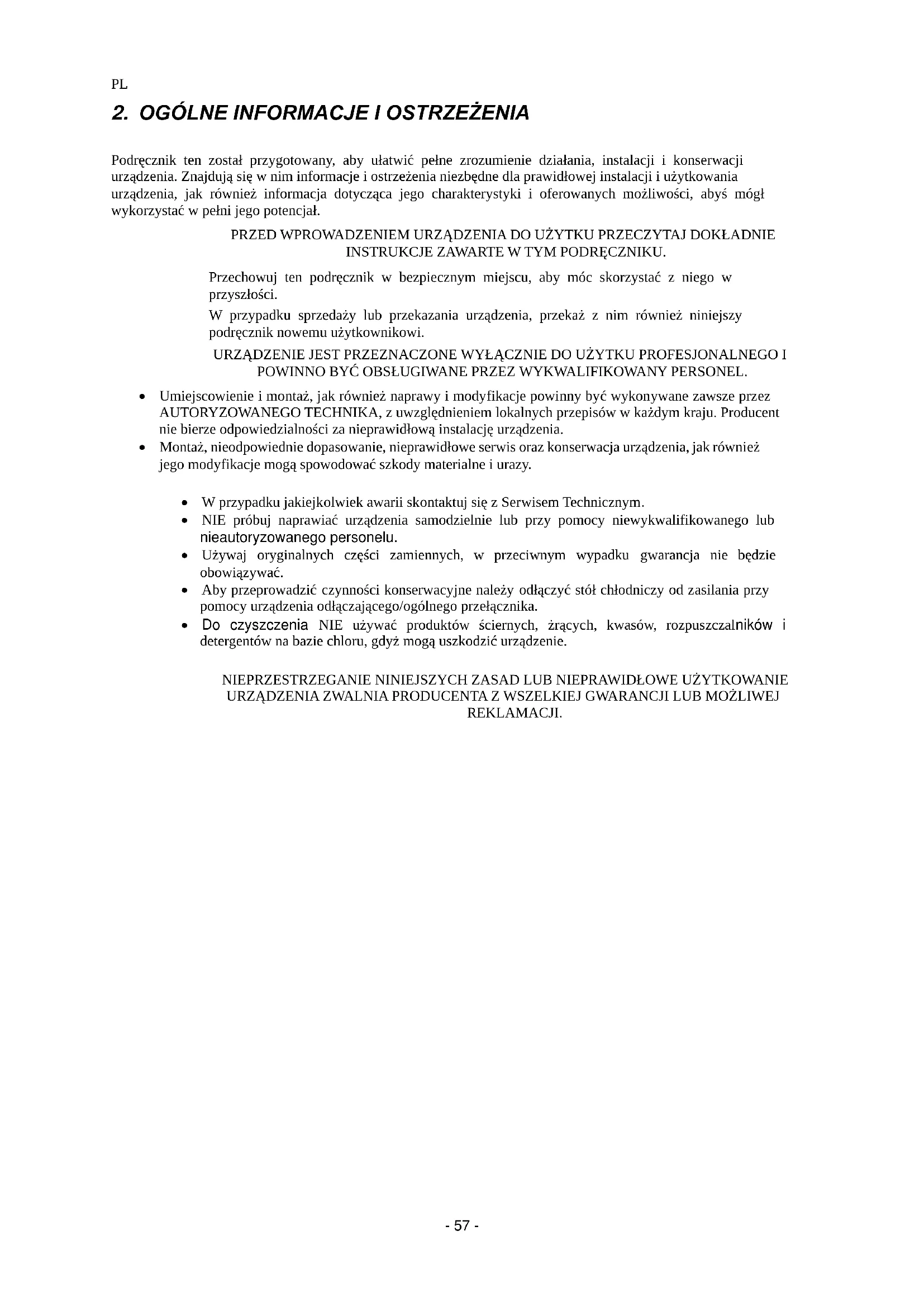 Nabyte urządzenie zostało zaprojektowane do przechowywania napojów i pożywienia. Zalecamy unikać wkładania do urządzenia gorącego jedzenia lub pojemników, chemii, produktów żrących lub leków i unikanie jego niewłaściwego użytkowania. W zależności od nabytego stołu można ustalić różne klasyfikacje ze względu na osiąganą temperaturę. TP (TP, TPB) /TS R-600a (HC) CYKL CHŁODZENIA: (od + 8 do -2°C) Urządzenia przeznaczone do przechowywania produktów świeżych lub wstępnie przygotowanych potraw przez krótki okres, jak również do chłodzenia napojów.