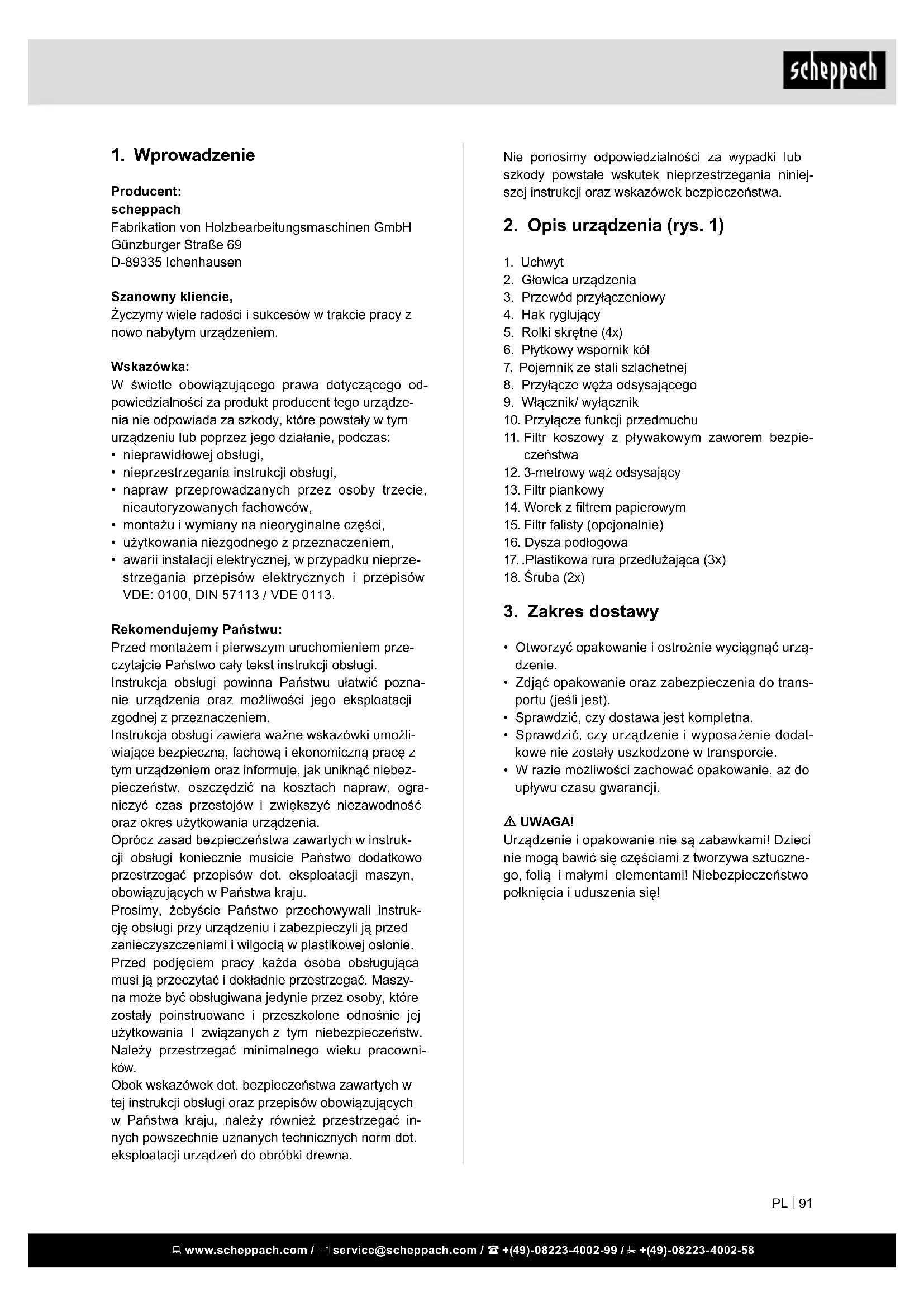 - awarii instalacji elektrycznej, w przypadku nieprze- strzegania przepisów elektrycznych i przepisów VDE: 0100, DIN 57113 / VDE 0113. Rekomendujemy Państwu: Przed montażem i pierwszym uruchomieniem prze- czytajcie Państwo cały tekst instrukcji obsługi. Instrukcja obsługi powinna Państwu ułatwić pozna- nie urządzenia oraz możliwości jego eksploatacji zgodnej z przeznaczeniem. Instrukcja obsługi zawiera ważne wskazówki umożli- wiające bezpieczną, fachową i ekonomiczną pracę z tym urządzeniem oraz informuje, jak uniknąć niebez- pieczeństw, oszczędzić na kosztach napraw, ogra- niczyć czas przestojów i zwiększyć niezawodność oraz okres użytkowania urządzenia. Oprócz zasad bezpieczeństwa zawartych w instruk- cji obsługi koniecznie musicie Państwo dodatkowo przestrzegać przepisów dot. eksploatacji maszyn, obowiązujących w Państwa kraju. Prosimy, żebyście Państwo przechowywali instruk- cję obsługi przy urządzeniu i zabezpieczyli ją przed zanieczyszczeniami i wilgocią w plastikowej osłonie. Przed podjęciem pracy każda osoba obsługująca musi ją przeczytać i dokładnie przestrzegać. Maszy- na może być obsługiwana jedynie przez osoby, które zostały poinstruowane i przeszkolone odnośnie jej użytkowania I związanych z tym niebezpieczeństw. Należy przestrzegać minimalnego wieku pracowni- ków. Obok wskazówek dot. bezpieczeństwa zawartych w tej instrukcji obsługi oraz przepisów obowiązujących w Państwa kraju, należy również przestrzegać in- nych powszechnie uznanych technicznych norm dot. eksploatacji urządzeń do obróbki drewna. www.scheppach.com / service@scheppach.com / +(49)-08223-4002-99 / +(49)-08223-4002-58