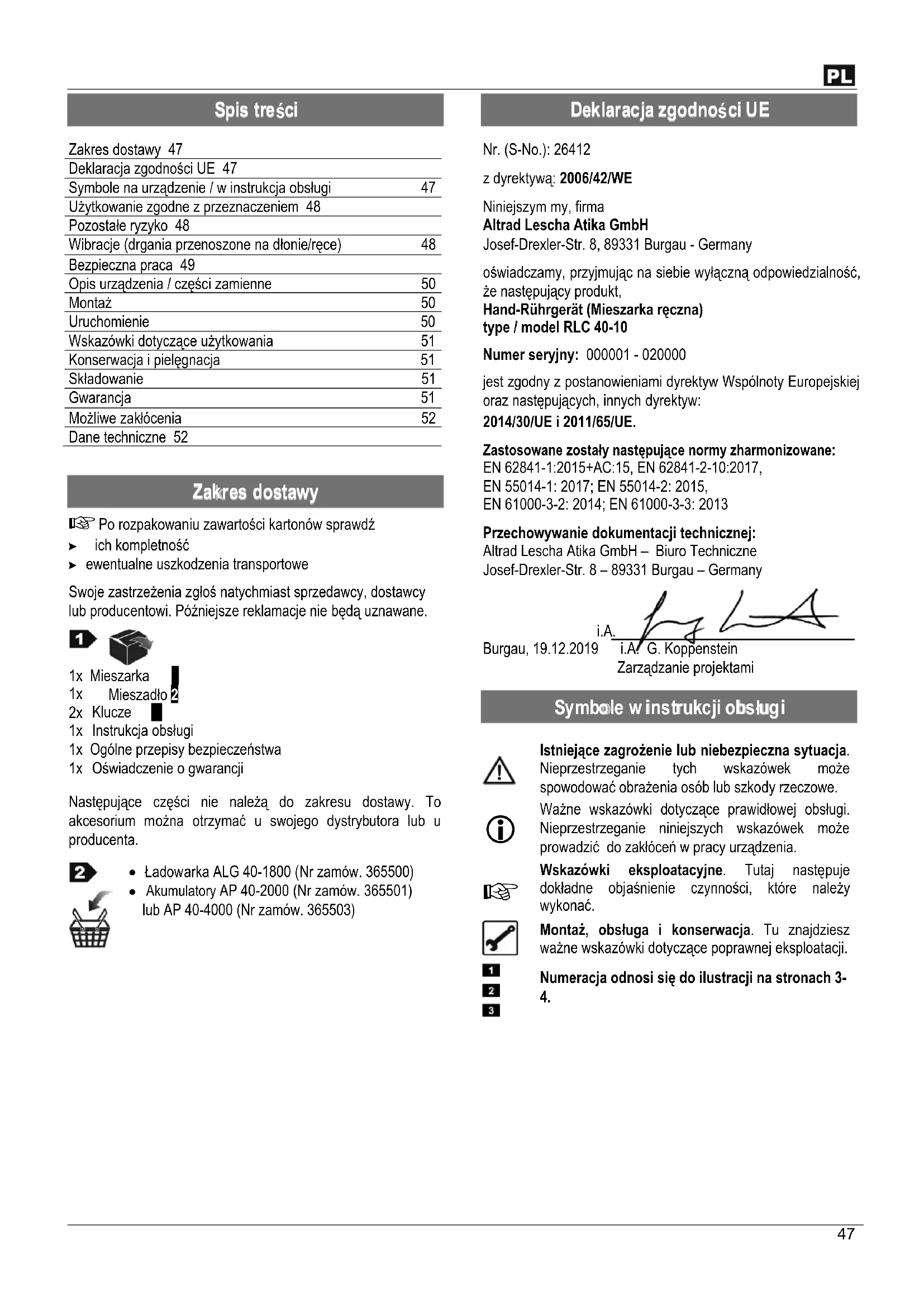 Nr. (S-No.): 26412 z dyrektywą: 2006/42/WE Niniejszym my, firma Altrad Lescha Atika GmbH Josef-Drexler-Str. 8, 89331 Burgau - Germany oświadczamy, przyjmując na siebie wyłączną odpowiedzialność, że następujący produkt, Hand-Rührgerät (Mieszarka ręczna) type / model RLC 40-10 Numer seryjny: 000001 - 020000 jest zgodny z postanowieniami dyrektyw Wspólnoty Europejskiej oraz następujących, innych dyrektyw: 2014/30/UE i 2011/65/UE. Zastosowane zostały następujące normy zharmonizowane: EN 62841-1:2015+AC:15, EN 62841-2-10:2017, EN 55014-1: 2017; EN 55014-2: 2015, EN 61000-3-2: 2014; EN 61000-3-3: 2013 Przechowywanie dokumentacji technicznej: Altrad Lescha Atika GmbH – Biuro Techniczne Josef-Drexler-Str. 8 – 89331 Burgau – Germany
