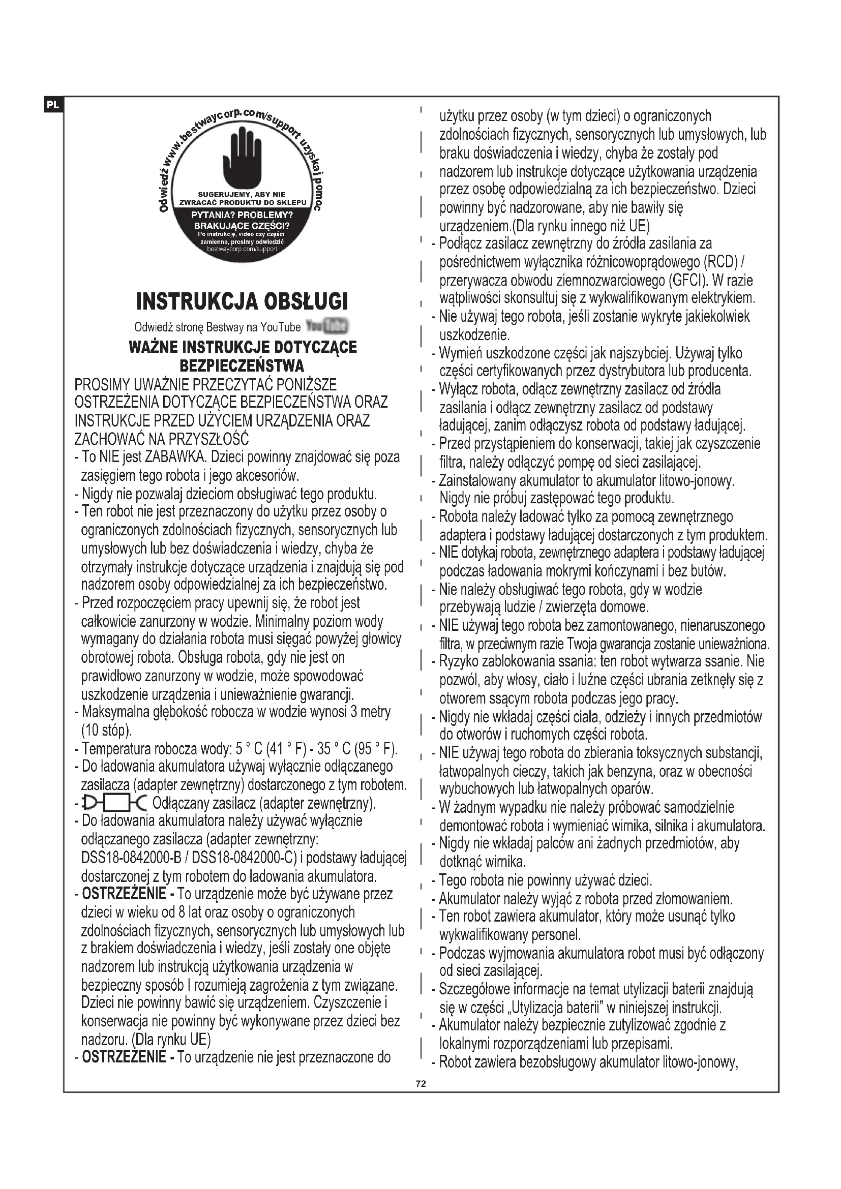 - To NIE jest ZABAWKA. Dzieci powinny znajdować się poza zasięgiem tego robota i jego akcesoriów. - Nigdy nie pozwalaj dzieciom obsługiwać tego produktu. - Ten robot nie jest przeznaczony do użytku przez osoby o ograniczonych zdolnościach fizycznych, sensorycznych lub umysłowych lub bez doświadczenia i wiedzy, chyba że otrzymały instrukcje dotyczące urządzenia i znajdują się pod nadzorem osoby odpowiedzialnej za ich bezpieczeństwo. - Przed rozpoczęciem pracy upewnij się, że robot jest całkowicie zanurzony w wodzie. Minimalny poziom wody wymagany do działania robota musi sięgać powyżej głowicy obrotowej robota. Obsługa robota, gdy nie jest on prawidłowo zanurzony w wodzie, może spowodować uszkodzenie urządzenia i unieważnienie gwarancji. - Maksymalna głębokość robocza w wodzie wynosi 3 metry (10 stóp). - Temperatura robocza wody: 5 ° C (41 ° F) - 35 ° C (95 ° F). - Do ładowania akumulatora używaj wyłącznie odłączanego zasilacza (adapter zewnętrzny) dostarczonego z tym robotem. - Odłączany zasilacz (adapter zewnętrzny). - Do ładowania akumulatora należy używać wyłącznie odłączanego zasilacza (adapter zewnętrzny: DSS18-0842000-B / DSS18-0842000-C) i podstawy ładującej dostarczonej z tym robotem do ładowania akumulatora. - OSTRZEŻENIE - To urządzenie może być używane przez dzieci w wieku od 8 lat oraz osoby o ograniczonych zdolnościach fizycznych, sensorycznych lub umysłowych lub z brakiem doświadczenia i wiedzy, jeśli zostały one objęte nadzorem lub instrukcją użytkowania urządzenia w bezpieczny sposób I rozumieją zagrożenia z tym związane. Dzieci nie powinny bawić się urządzeniem. Czyszczenie i konserwacja nie powinny być wykonywane przez dzieci bez nadzoru. (Dla rynku UE) - OSTRZEŻENIE - To urządzenie nie jest przeznaczone do użytku przez osoby (w tym dzieci) o ograniczonych zdolnościach fizycznych, sensorycznych lub umysłowych, lub braku doświadczenia i wiedzy, chyba że zostały pod nadzorem lub instrukcje dotyczące użytkowania urządzenia przez osobę odpowiedzialną za ich bezpieczeństwo. Dzieci powinny być nadzorowane, aby nie bawiły się urządzeniem.(Dla rynku innego niż UE) - Podłącz zasilacz zewnętrzny do źródła zasilania za pośrednictwem wyłącznika różnicowoprądowego (RCD) / przerywacza obwodu ziemnozwarciowego (GFCI). W razie wątpliwości skonsultuj się z wykwalifikowanym elektrykiem. - Nie używaj tego robota, jeśli zostanie wykryte jakiekolwiek uszkodzenie. - Wymień uszkodzone części jak najszybciej. Używaj tylko części certyfikowanych przez dystrybutora lub producenta. - Wyłącz robota, odłącz zewnętrzny zasilacz od źródła zasilania i odłącz zewnętrzny zasilacz od podstawy ładującej, zanim odłączysz robota od podstawy ładującej. - Przed przystąpieniem do konserwacji, takiej jak czyszczenie filtra, należy odłączyć pompę od sieci zasilającej. - Zainstalowany akumulator to akumulator litowo-jonowy. Nigdy nie próbuj zastępować tego produktu. - Robota należy ładować tylko za pomocą zewnętrznego adaptera i podstawy ładującej dostarczonych z tym produktem. - NIE dotykaj robota, zewnętrznego adaptera i podstawy ładującej podczas ładowania mokrymi kończynami i bez butów. - Nie należy obsługiwać tego robota, gdy w wodzie przebywają ludzie / zwierzęta domowe. - NIE używaj tego robota bez zamontowanego, nienaruszonego filtra, w przeciwnym razie Twoja gwarancja zostanie unieważniona. - Ryzyko zablokowania ssania: ten robot wytwarza ssanie. Nie pozwól, aby włosy, ciało i luźne części ubrania zetknęły się z otworem ssącym robota podczas jego pracy. - Nigdy nie wkładaj części ciała, odzieży i innych przedmiotów do otworów i ruchomych części robota. - NIE używaj tego robota do zbierania toksycznych substancji, łatwopalnych cieczy, takich jak benzyna, oraz w obecności wybuchowych lub łatwopalnych oparów. - W żadnym wypadku nie należy próbować samodzielnie demontować robota i wymieniać wirnika, silnika i akumulatora. - Nigdy nie wkładaj palców ani żadnych przedmiotów, aby dotknąć wirnika. - Tego robota nie powinny używać dzieci. - Akumulator należy wyjąć z robota przed złomowaniem. - Ten robot zawiera akumulator, który może usunąć tylko wykwalifikowany personel. - Podczas wyjmowania akumulatora robot musi być odłączony od sieci zasilającej. - Szczegółowe informacje na temat utylizacji baterii znajdują się w części „Utylizacja baterii” w niniejszej instrukcji. - Akumulator należy bezpiecznie zutylizować zgodnie z lokalnymi rozporządzeniami lub przepisami. - Robot zawiera bezobsługowy akumulator litowo-jonowy,