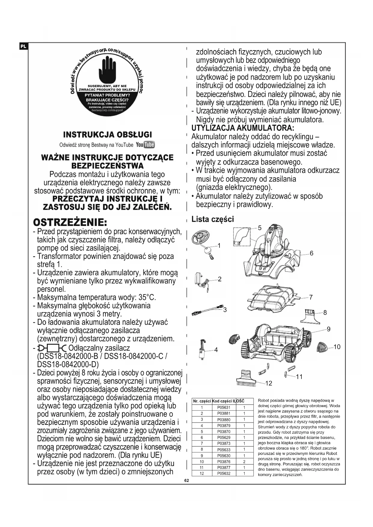 akumulator, nacisnąć zacisk na złączu, a następnie wyciągnąć go. UWAGA: Natychmiast owinąć złącze taśmą izolacyjną z celu uniknięcia zwarcia spowodowanego przez kontakt między obiema końcówkami przewodów. UTYLIZACJA Zużytych produktów elektrycznych nie należy wyrzucać razem z odpadami domowymi. Zużyty product oddaj do miejsca zajmującego się recyklingiem. Skontaktuj się z lokalnymi władzami lub sprzedawcą w celu uzyskania porady na temat recyklingu. Rozwiązywanie problemów Problem Robot nie zbiera zanieczyszczeń. Robot porusza się powoli. Robot zatrzymał się na środku basenu (głowica wciąż się obraca). Robot został zatrzymany przez ssanie z głównego odpływu dennego basenu. Aby uzyskać pomoc, odwiedź sekcję pomocy technicznej na naszej stronie internetowej, www.bestwaycorp.com. Sprawdzić, czy w basenie znajduje się przedmiot blokujący robota. Usunąć przeszkodę. Postępować zgodnie z instrukcjami z podręcznika użytkownika, aby prawidłowo ustawić pozycję sworznia blokującego i zastosować zderzak. Upewnić się, że zderzaki zostały założone (zob. wskazówki z instrukcji). Postępować zgodnie ze wskazówkami z instrukcji, aby założyć zderzaki po obu stronach robota. Czas pracy jest krótszy niż oczekiwano. Nieprawidłowe ustawienie sworznia blokującego/wymagany jest zderzak. Robot porusza się wzdłuż ściany okrągłego basenu. Za mało miejsca, aby robot mógł zmienić kierunek. Kierunek poruszania się jest przerywany przez cyrkulację wody wytwarzaną przez system filtrujący. Wyłączyć robota i sprawdzić wzrokowo otwór pod odpadami. Aby uzyskać pomoc, odwiedź sekcję pomocy technicznej na naszej stronie internetowej, www.bestwaycorp.com. OSTRZEŻENIE! Przed serwisowaniem upewnić się, że robot jest wyłączony. Robot nie oczyszcza całego basenu / porusza się wzdłuż ściany basenu. Robot zakleszczony w wąskim miejscu basenu zagłębionego w ziemi. Możliwa przyczyna Niski stan akumulatora. Naładować akumulator ponownie. Oczyścić komorę zanieczyszczeń i pokrywę filtra. Wyłączyć system filtracji (zob. instrukcję obsługi). Oczyścić komorę zanieczyszczeń Oczyścić komorę filtra i ponownie ładować robota przez 5-6 godz. Wyłączyć system filtracji (zob. instrukcję obsługi). Sprawdzić koło i usunąć z niego zanieczyszczenia. Oczyścić komorę zanieczyszczeń i pokrywę filtra. Wirnik jest zablokowany. Wirnik jest uszkodzony. Komora zanieczyszczeń jest pełna. Robot zatrzymał się na przeszkodzie. Komora zanieczyszczeń jest pełna. Koło jest zablokowane. Komora zanieczyszczeń jest pełna. Rozwiązanie67 Z robota wydostają się zanieczyszczenia. Pływak tonie. Upewnić się, czy płytka filtra spustowego jest na miejscu i w razie potrzeby wymienić na nową przed następnym użyciem. Wymienić pokrywę filtra na nową. Aby uzyskać pomoc, odwiedź sekcję pomocy technicznej na naszej stronie internetowej, www.bestwaycorp.com. Odłącz głowicę obrotową i pierścień wygładzający zgodnie z instrukcjami w rozdziale „Jak wyjąć akumulator” z instrukcji, a następnie: - Usuń uwięzione zanieczyszczenia - Sprawdź, czy pierścień wygładzający i dolna płyta są prawidłowo zainstalowane (patrz poniższe schematy) - Sprawdzić pierścień wygładzający pod kątem potencjalnych uszkodzeń i zużycia. W razie potrzeby wymień na nowy Klapa otworu ssącego (umieszczona od spodu) jest uszkodzona. Płytka filtra spustowego jest uszkodzona lub nie jest na miejscu. Wymienić na nowy pierścień wygładzający głowicy obrotowej. Aby uzyskać pomoc, odwiedź sekcję pomocy technicznej na naszej stronie internetowej, www.bestwaycorp.com. Wymienić na nowy pływak. Aby uzyskać pomoc, odwiedź sekcję pomocy technicznej na naszej stronie internetowej, www.bestwaycorp.com. OSTRZEŻENIE! Aby uzyskać pomoc, odwiedź sekcję pomocy technicznej na naszej stronie internetowej, www.bestwaycorp.com. NIE otwierać robota i nie wymieniać samodzielnie akumulatora. Grozi to poważnymi lub nawet śmiertelnymi urazami i będzie skutkowało unieważnieniem gwarancji. Aby uzyskać pomoc, odwiedź sekcję pomocy technicznej na naszej stronie internetowej, www.bestwaycorp.com. OSTRZEŻENIE! Korzystanie z niewłaściwego zewnętrznego zasilacza spowoduje uszkodzenie robota/akumulatora i unieważnienie gwarancji. Upewnić się, że kabel ładowania jest prawidłowo i całkowicie podłączony do zewnętrznego zasilacza i robota. Zob. instrukcję obsługi. Klapa otworu ssącego działa jak drzwi, aby zapobiec uciekaniu zanieczyszczeń z komory zanieczyszczeń. Aby uzyskać pomoc, odwiedź sekcję pomocy technicznej na naszej stronie internetowej, www.bestwaycorp.com. Kabel ładowania nie jest w pełni połączony z zewnętrznym adapterem i robotem. Głowica obrotowa nie obraca się, lub obraca się zauważalnie powoli. Zanieczyszczenia wydostają się poza pokrywę filtra. Robota nie można naładować/ ponownie naładować. Sprawdzić i usunąć zanieczyszczenia, które utrudniają poruszanie się klapy. Spód głowicy obrotowej jest zablokowany. Klapa boczna jest zablokowana. Pierścień wygładzający głowicy obrotowej jest uszkodzony. Siatka pokrywy filtra jest uszkodzona. Pływak jest uszkodzony i dostaje się do niego woda. Akumulator jest uszkodzony. Zewnętrzny zasilacz jest niesprawny.FONTOS BIZTONSÁGI UTASÍTÁSOK Az elektromos berendezés telepítésekor és használatakor kötelezően kövesse az alapvető óvintézkedéseket, így például: