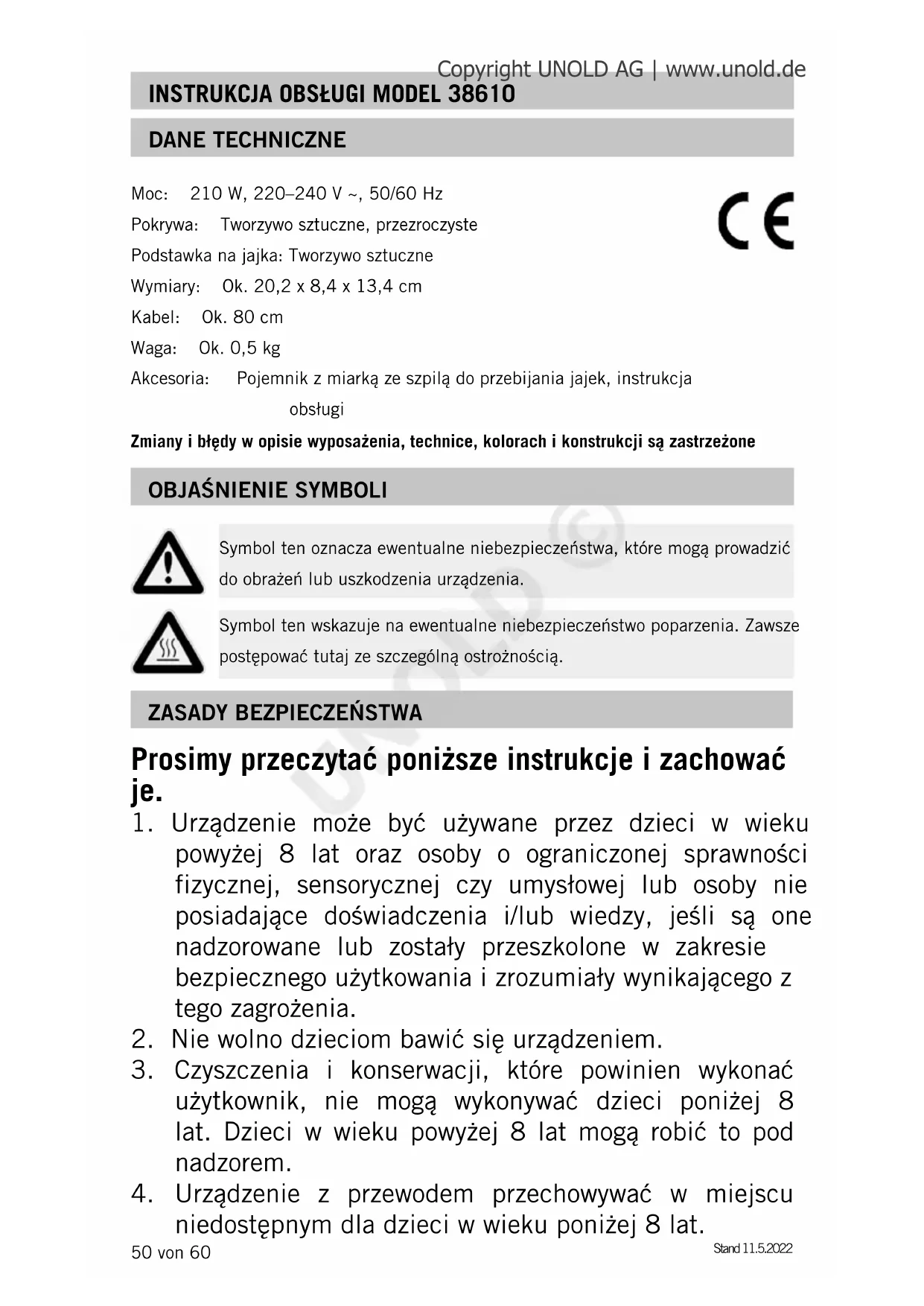 Mini 38610 - Gotowiec do jajek UNOLD - Bezpłatna instrukcja obsługi