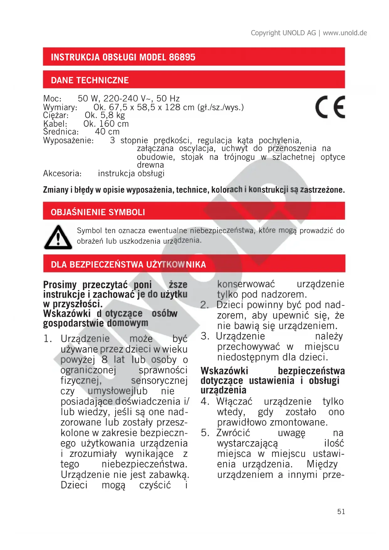 Kolonial 86895 - Wentylator UNOLD - Bezpłatna instrukcja obsługi