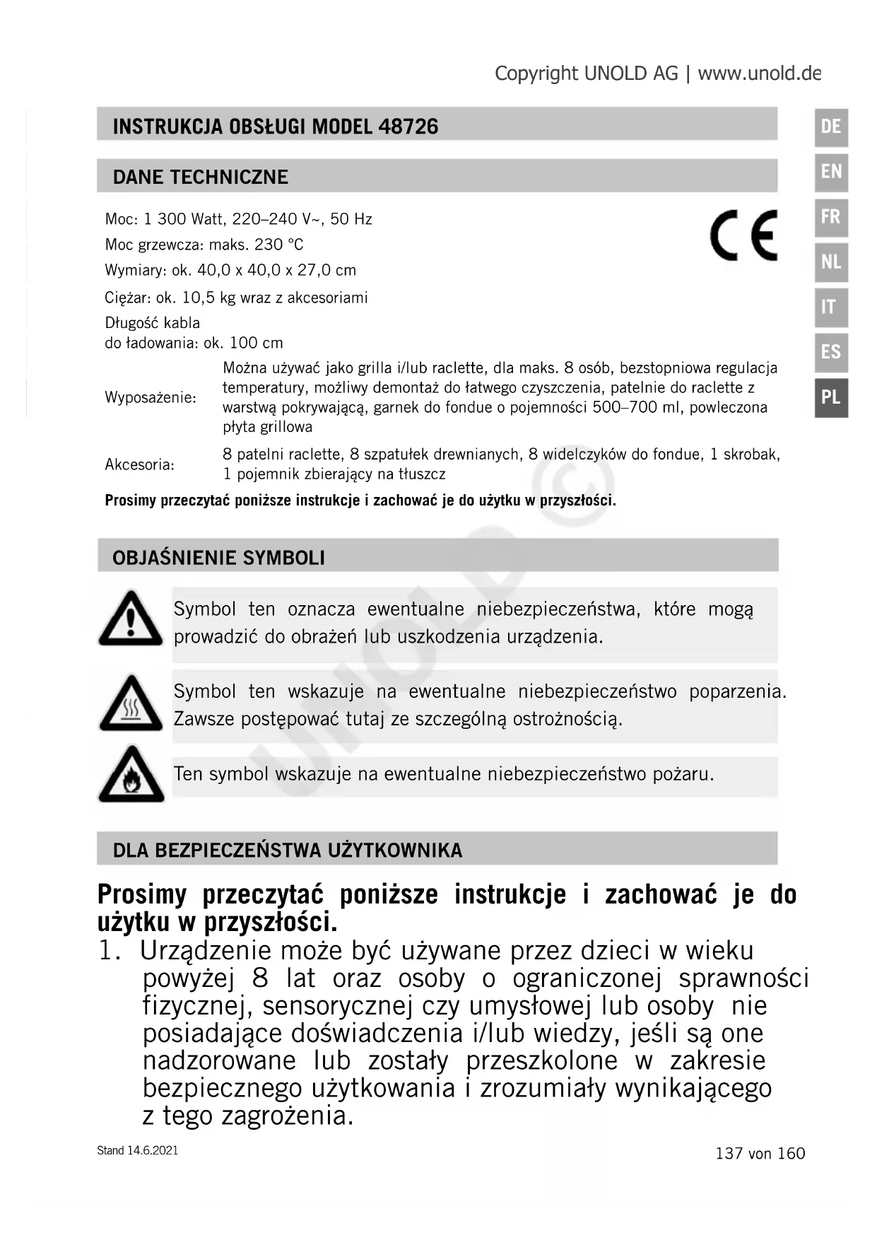 powyżej 8 lat oraz osoby o ograniczonej sprawności fizycznej, sensorycznej czy umysłowej lub osoby nie posiadające doświadczenia i/lub wiedzy, jeśli są one nadzorowane lub zostały przeszkolone w zakresie bezpiecznego użytkowania i zrozumiały wynikającego z tego zagrożenia. Ten symbol wskazuje na ewentualne niebezpieczeństwo pożaru. Copyright UNOLD AG | www.unold.de UNOLD ©138 von 160 Stand 14.6.2021
